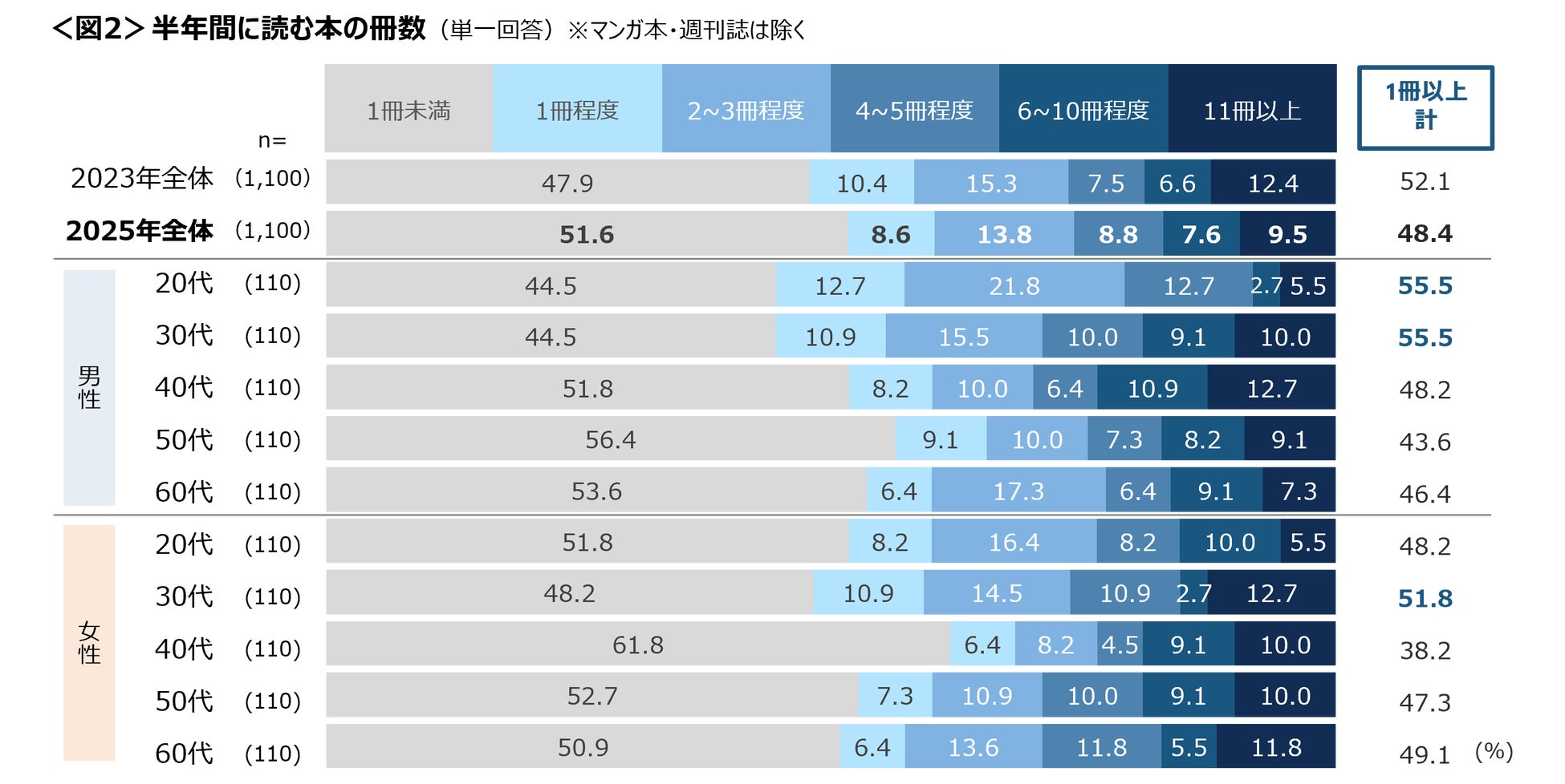 半年間に読む本の冊数は「1冊未満」が51.6%で、2023年と比べ微増。