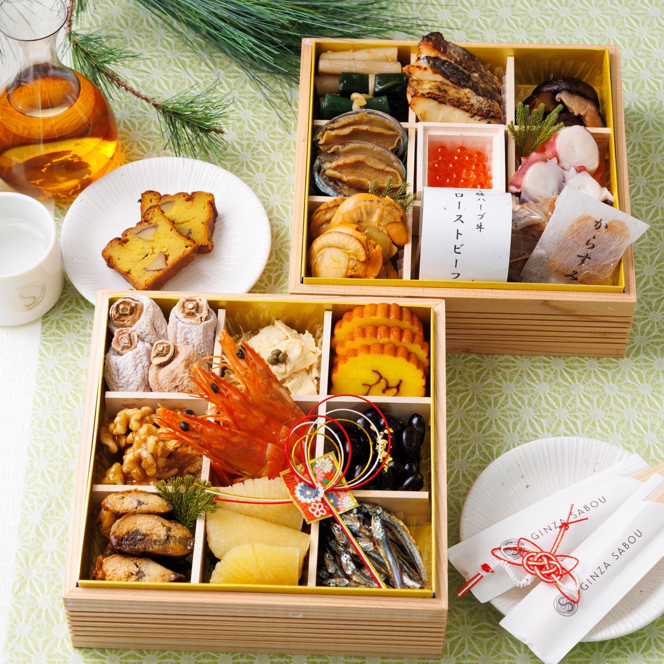 福を招く多彩な食材を織り込み、自然で上品な味わいに仕上げた、贅沢二段お重のおせち。今年は、SALON GINZA SABOUの特製甘味「和栗の焼ききんとん」と合わせてお送りいたします。ご好評いただいている、少人数でのお召し上がりに最適な食べきりサイズ(2~3人前)にプラスして、本年は、ご家族皆さまでお 召し上がりいただけるサイズ(4~5人前)が登場!