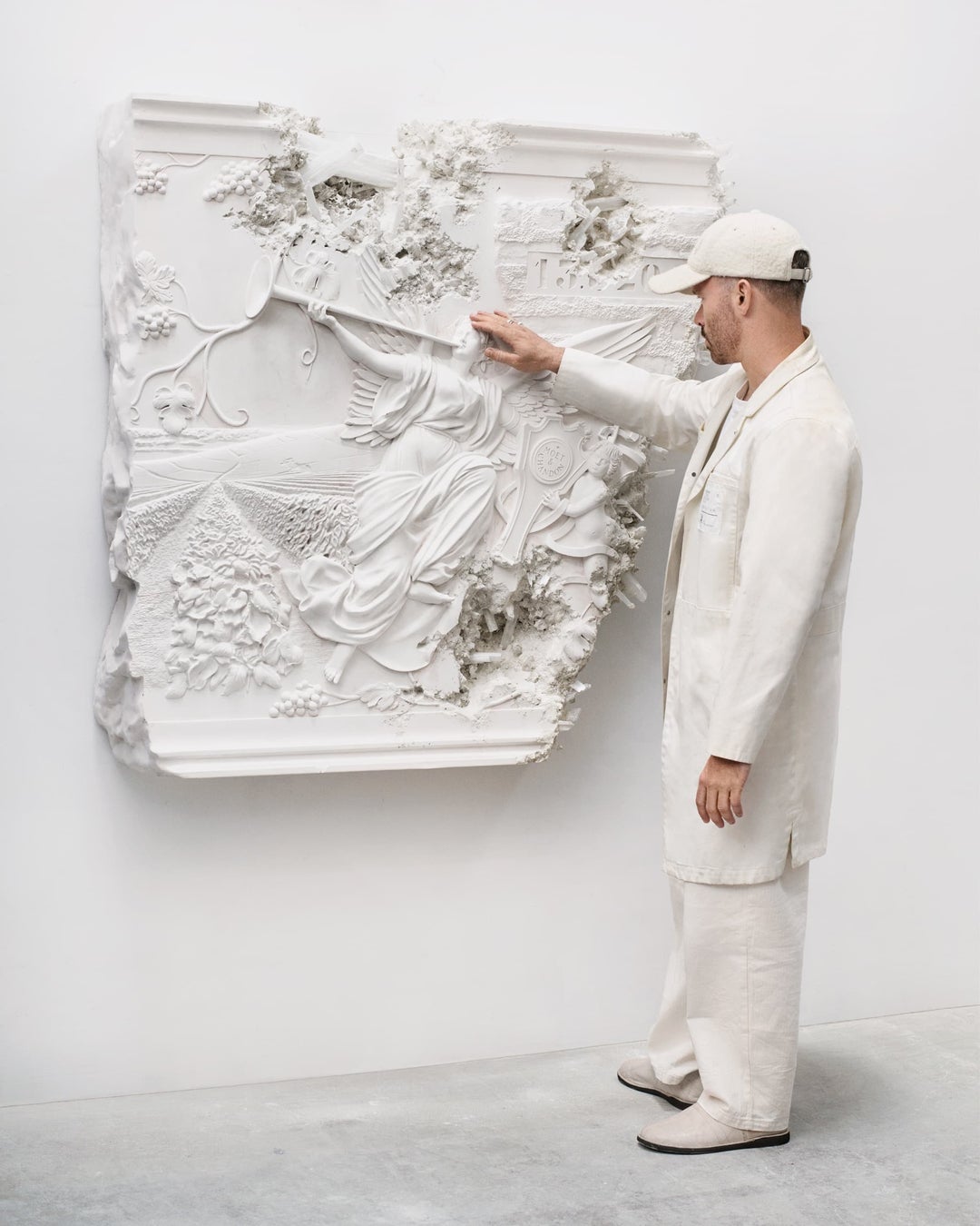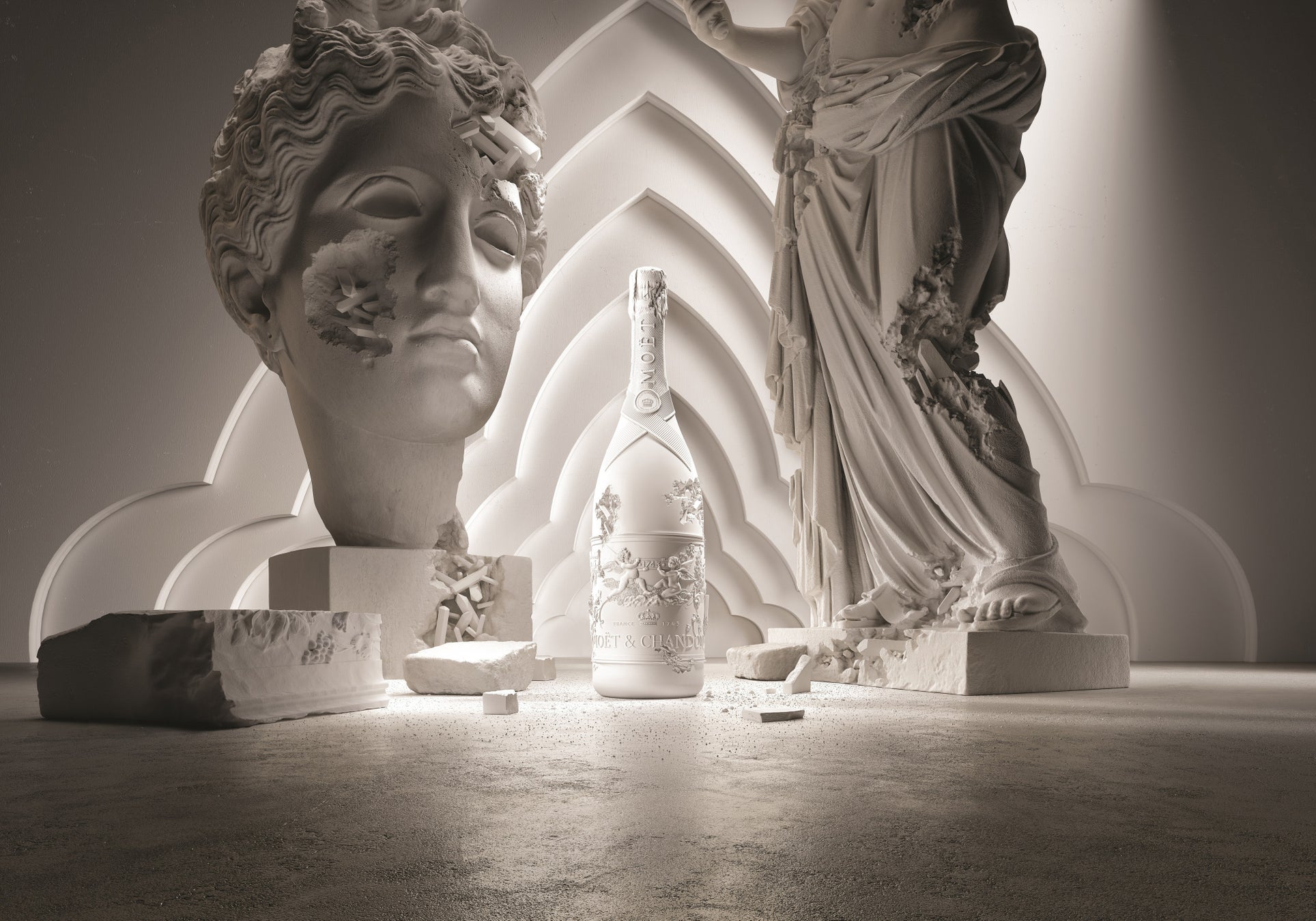 本作品は、ダニエル・アーシャムがモエ・エ・シャンドン メゾンを初めて訪れた際に、最高醸造責任者のブノワ・ゴエズが案内した、1890年代よりセラーの入り口に飾られているステンドグラスから着想を得て制作。このメゾンの伝統を寓話的に表現した作品の素材には、セラーの壁を飾る白亜質の土壌を意識し、白い鋳造樹脂を採用しました。作品にあえて施された浸食の痕跡は、アーティストの作品性を表現するだけにとどまらず、このマスターピースに時代を超越した質感を吹き込む神秘的な要素の一つでもあるのです。