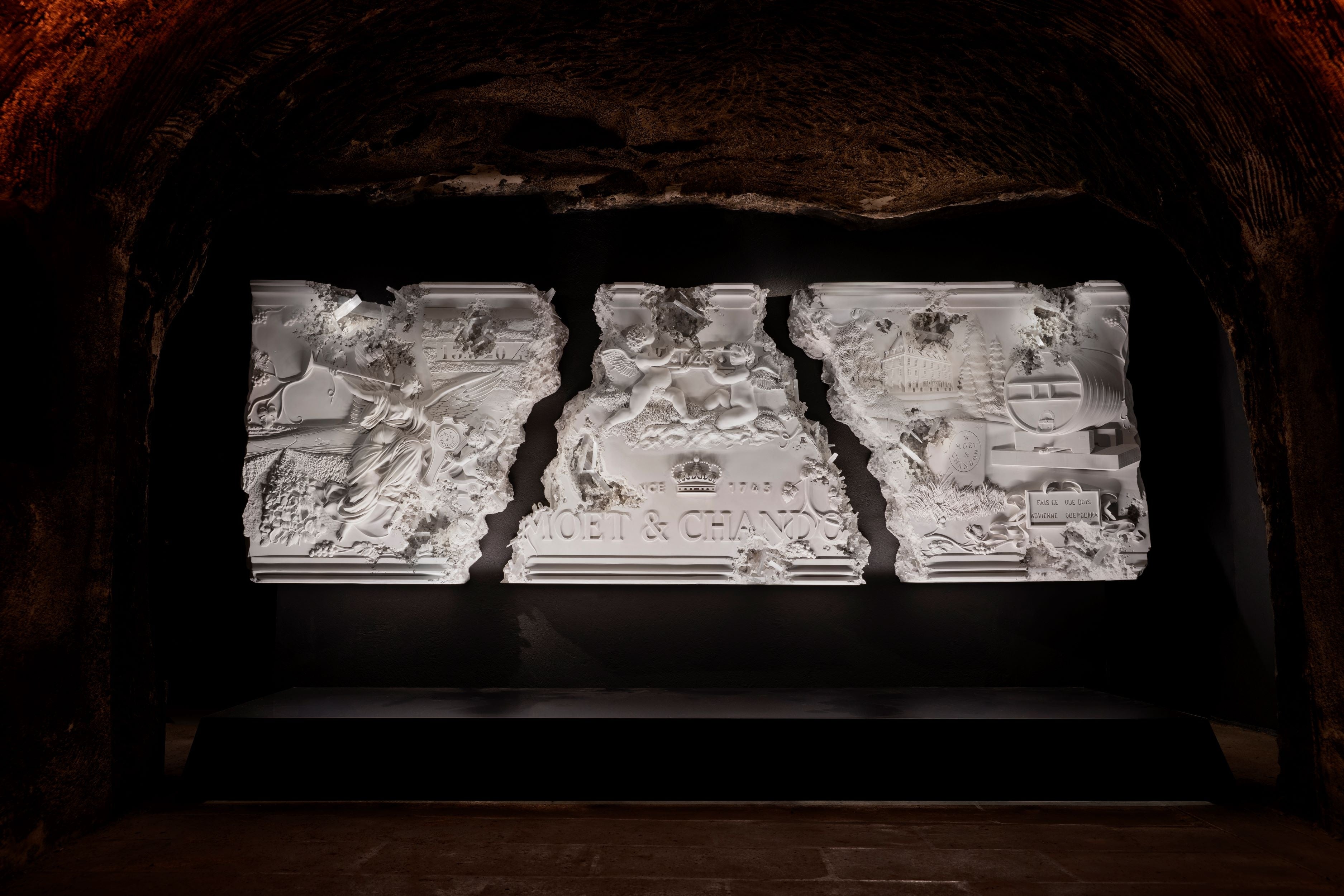 長さ3メートル、高さ1.3メートルの白亜のレリーフ上に、モエ・エ・シャンドンにとって象徴的なモチーフを彫刻することで、280年もの歴史を紡いできたモエ・エ・シャンドン メゾンの伝統や格式を表現しています。作品の中央のパートには、二人の天使とメゾンの創業年である「1743年」のプレートで、クロード・モエによって設立したメゾンの誕生のフェーズを表現。向かって左のパートには、トランペットを鳴らす、ギリシア神話に登場する名声を象徴する女神「フェーム」を登場させることで、メゾンの名声が世にあまねく広まる様をメタファーとして表しています。向かって右のパートには、メゾンの歴史を表すシャトー・ド・サランの建物や、エペルネの豊かな自然とシャンパーニュ地方の多様性を表現したモチーフである広大なブドウ畑、メゾンの優れたワイン製造技術とナポレオン皇帝との繋がりに敬意を示す木製のワイン樽をそれぞれ配置しています。
