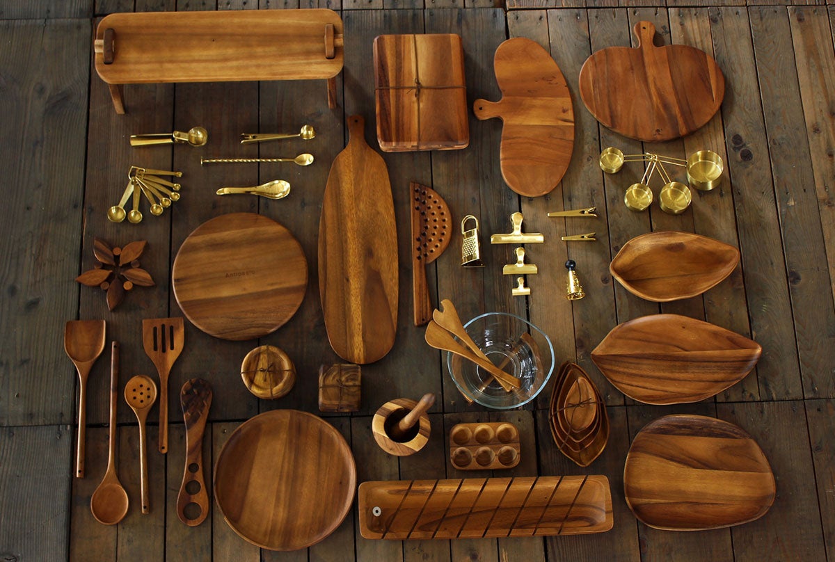 料理を乗せるだけでワンランクアップするアカシアの木から作られた食器と、使うだけで気分がアップするブラスカラーの調理器具で展開しているシリーズ。まさしく美味しい料理を助けるキッチンアイテムです。