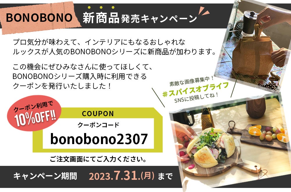 新商品発売を記念して、直営ECサイト「SPICE OF LIFEオンラインストア」にて「BONOBONOシリーズ」購入時に利用できるクーポンを発行いたしました。