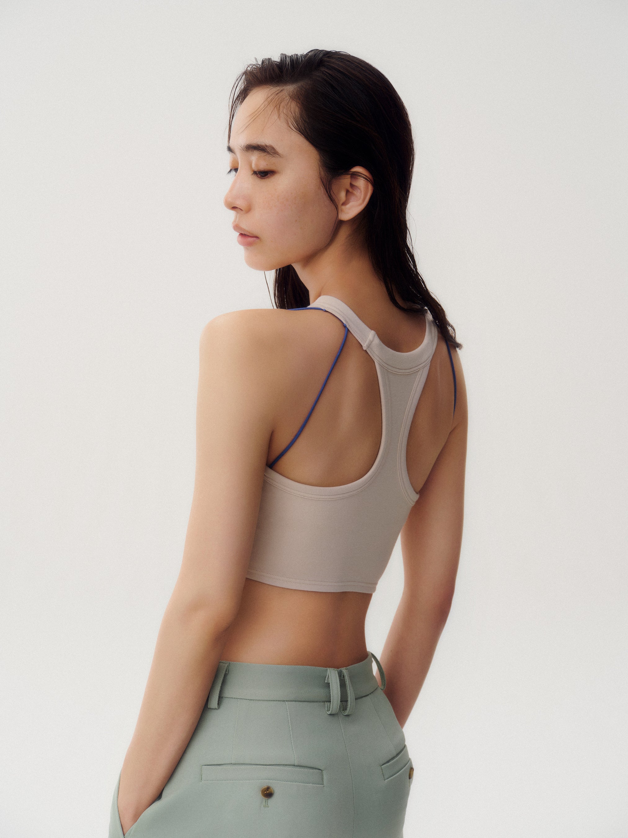 カッティングにこだわった、ヘルシーな印象のクロップド丈のアメリカンスリーブタイプのブラトップ。伸びのよいスムース生地を使用し、コンパクトなシルエットに仕上げました。バイカラーが印象的なベージュと、クールに着映えるブラックの2カラーで展開。アームホールのデザインストラップが、デザインのアクセントになっています。