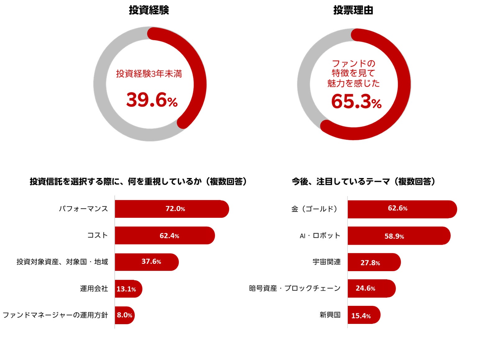 今回の投票では、投資経験3年未満の方が約4割と、新しいNISA制度開始以降に資産づくりを始めたお客様にも多くご参加いただきました。各部門の投票理由について、「(今回の「ノミネートファンド」の)特徴を見て、魅力を感じた」と回答したお客様が多く、「楽天証券ファンドアワード」を通じて新たな投資対象を発見するきっかけが生まれていることが伺えました。また、資産づくり・投資で、投資信託を選択する際に重視している点は、「運用成績(パフォーマンス)」が最も多く、次いで「コスト」や「投資対象」が続いたほか、今後の注目しているテーマとして、「金(ゴールド)」や「AI・ロボット」が上位にあがりました。