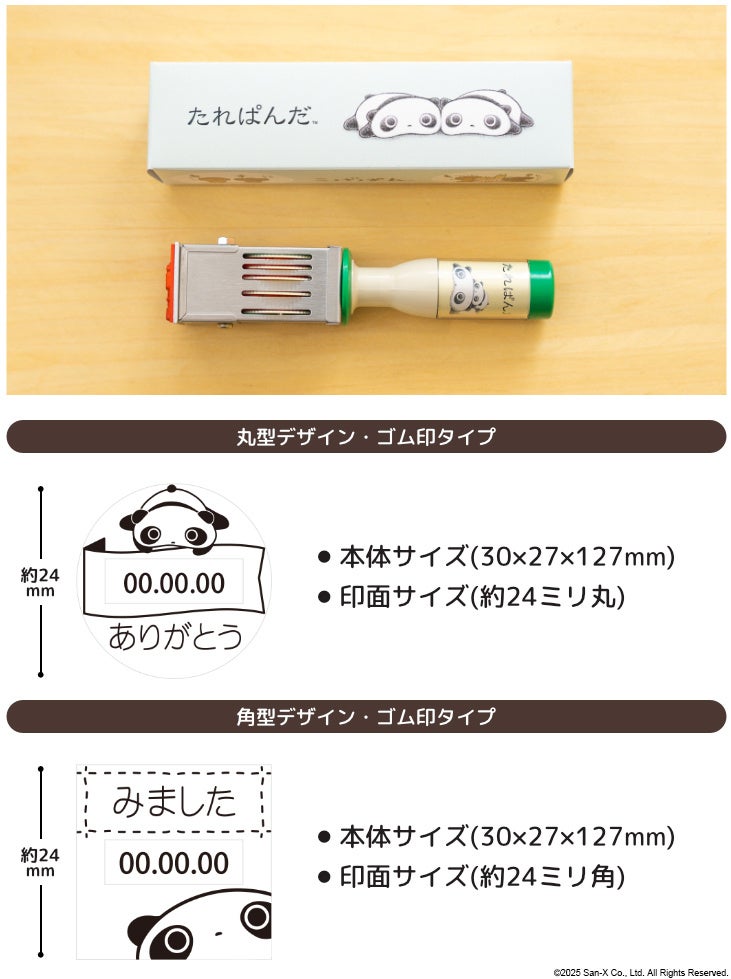日付印本体のサイズは横30×縦27×高さ127ミリ。印面サイズは丸型・角型ともに約24ミリ。スタンプ本体の持ち手部分や専用BOXにも、かわいいキャラクターがあしらわれています。