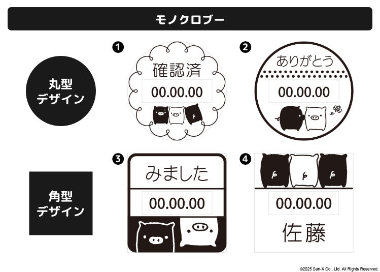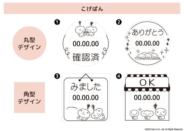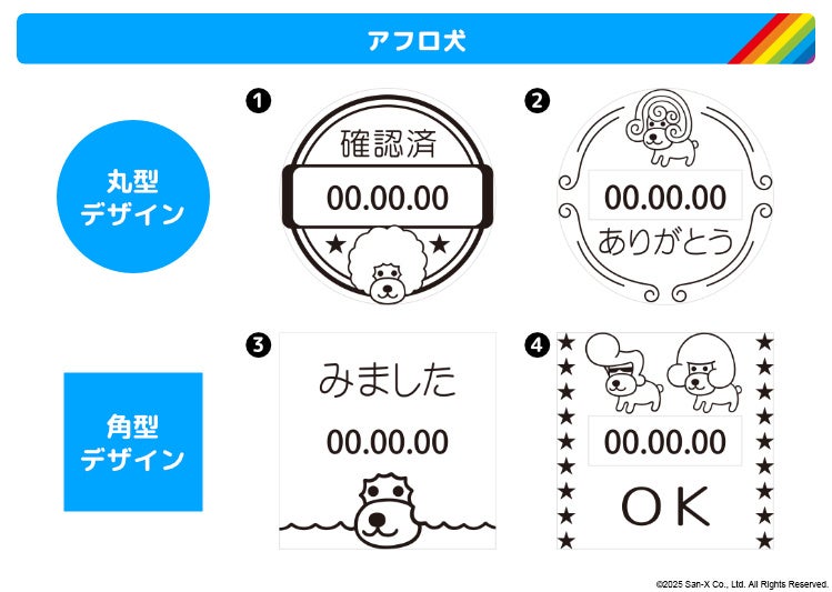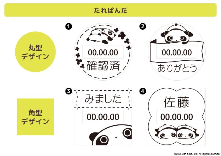 サンエックスのレジェンドキャラクター「たれぱんだ」「こげぱん」「アフロ犬」「モノクロブー」が日付をお知らせ。押すたびにほっこり癒してくれる日付印です