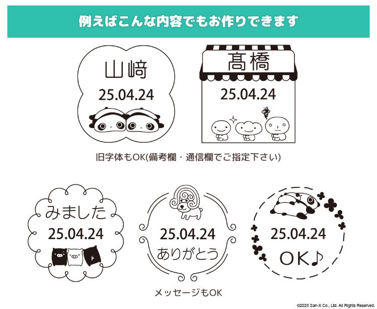 「San-X レジェンドキャラクター 日付印コレクション」は、1990年代~2000年代にかつて一世を風靡した、San-X (サンエックス)のレジェンドキャラクターである「たれぱんだ」「こげぱん」「アフロ犬」「モノクロブー」のキャラクターに好きな名前や文字を入れてつくれるオーダーメイドの日付印。懐かしくてかわいいキャラクターが、手帳やノートをかわいく彩ります。