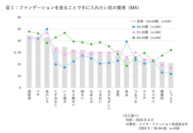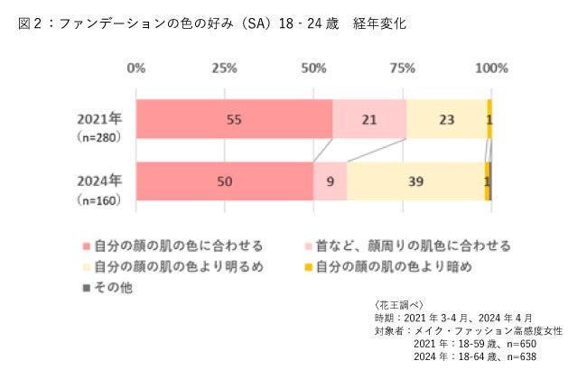 2024年に実施した調査では、ファンデーションで手に入れたい肌の質感として、全体的に「透明感」「ツヤ」「くすみなし」など、トーンアップ肌へのニーズが高く、特に18‐24歳の若年層では「色白」というキーワードも突出。(図1)またファンデーションの色の好みを調査した結果でも、若年層の約40%が「顔の肌の色よりも明るめの色」と回答し、その傾向は3年前より高まっています。(図2)ファンデーションは「自分の素肌の色」に合わせて選ぶのではなく、明るい色を中心に、「なりたい肌の色」で選ぶというニーズが増えてきていることがわかります。
