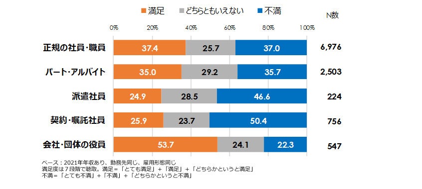 収入に対する満足度は、「正規の社員・職員」では満足37.4%、不満37.0%、「パート・アルバイト」では満足35.0%、不満35.7%と、満足と不満が拮抗している。「派遣社員」と「契約・嘱託社員」では不満がそれぞれ46.6%、50.4%と不満が満足を上回り、「会社・団体の役員」では満足53.7%と満足が不満を上回る。