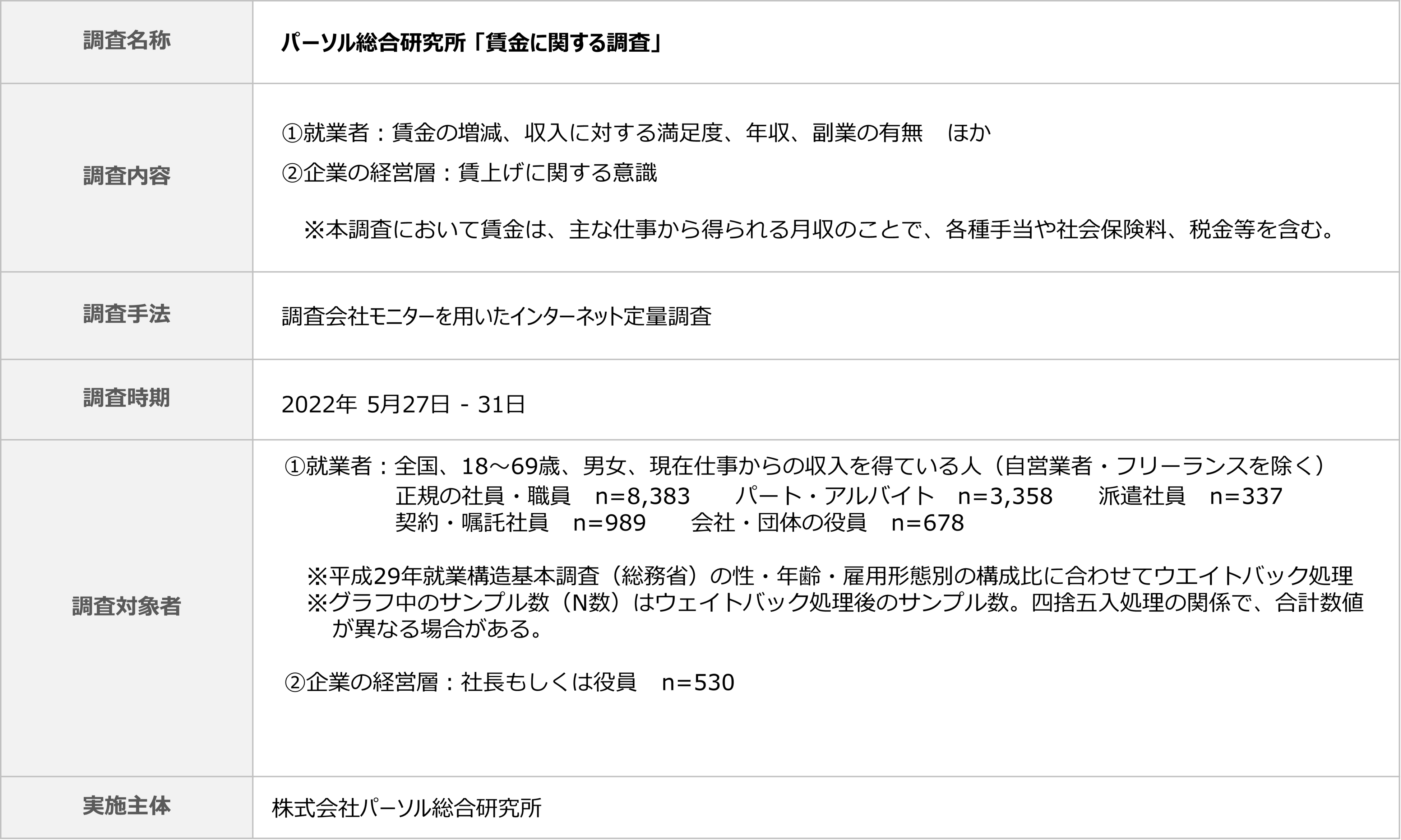 株式会社パーソル総合研究所(本社:東京都港区、代表取締役社長:渋谷和久)は、賃金に関する調査結果を発表いたします。本調査は、就業者の賃金に関する実態および、企業の経営層の賃上げに対する意識などについて、定量的なデータで把握し、経営・人事に資する提言を行うことを目的に実施しました。