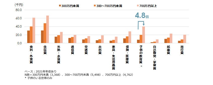 支出に関しては、世帯年収が高いほど支出は多い傾向にある。また、世帯年収700万円以上と300万円未満で最も支出額の差が大きかった費目は「子供の教育費」で、700万円以上の世帯は300万円未満の世帯の4.8倍支出している。収入のギャップが子供の教育に影響することを示唆している。