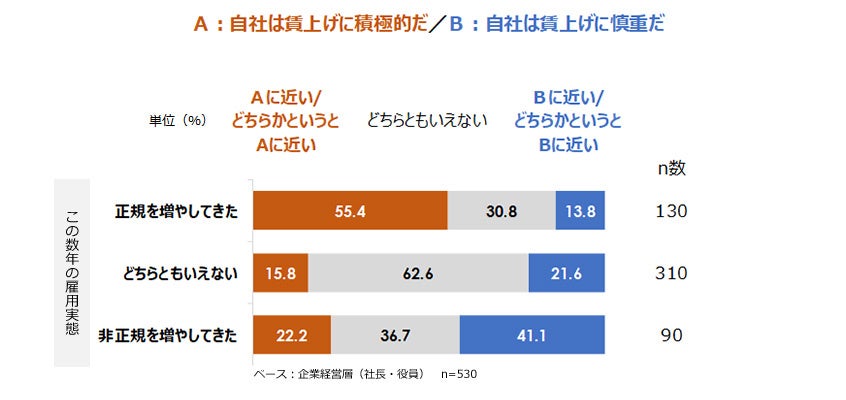 この数年の雇用実態と、今後の雇用意向ならびに賃上げへの姿勢について聞いたところ、これまで正規社員を増やしてきた企業は、今後も正規社員を増やす意向が強く(75.4%)【図表10上】、賃上げにも積極的(55.4%)【図表11上】である。一方、非正規社員を増やしてきた企業は、今後も非正規社員を増やす意向が強く(53.3%)【図表10下】、賃上げにも慎重(41.1%)【図表11下】であった。正規社員の雇用や賃上げを進める企業と、非正規社員の雇用や賃金抑制を進める企業とで、今後二極化していくことが示唆される。