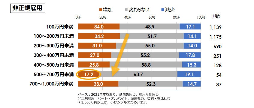 年収階層別に前年からの賃金の増減を見ると、「100~200万円未満」から「500~700万円未満」の年収階層において、正規雇用者では年収が高い層ほど賃金が増加した人の割合が多いのに対し【図表4】、非正規雇用者では年収が低い層ほど賃金が増加した人の割合が多かった【図表5】。正規雇用の高年収層は収入が伸びていく一方で、非正規雇用者や正規雇用の低収入層は収入が伸び悩む傾向を示している。