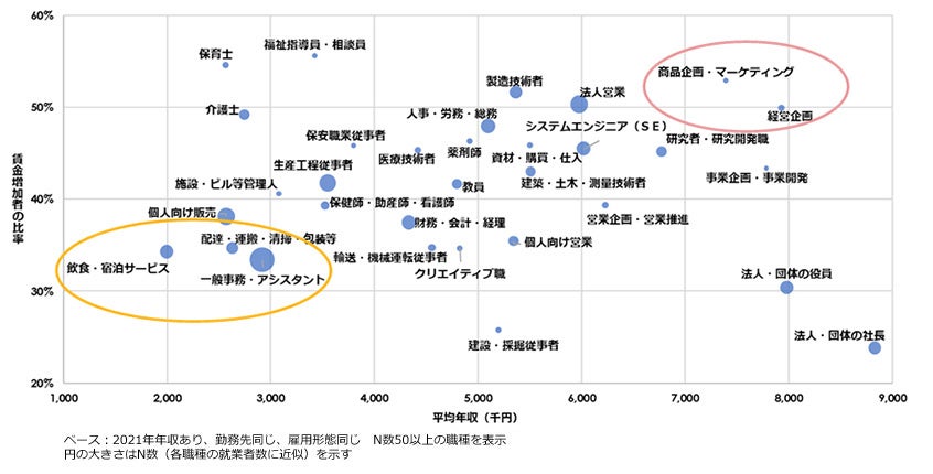 職種別に、「平均年収」と「前年からの賃金増加者の比率」の分布を見ると、「経営企画」「商品企画・マーケティング」など企画系職種で平均年収が高く、賃金が増加した人の割合が多い傾向にある。一方で、「飲食・宿泊サービス」「配達・運搬・清掃・包装等」「一般事務・アシスタント」は平均年収が低く、賃金が増加した人の割合も少ない傾向にある。