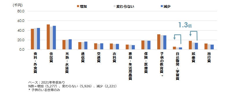 賃金の増減別に支出を見ると、賃金が増加した人のほうが全般的に支出の多い傾向にある。特に、「自己啓発・学習費」と「娯楽費」で支出額の差が大きく、いずれも賃金が増加した人は減少した人の1.3倍の額を支出している。
