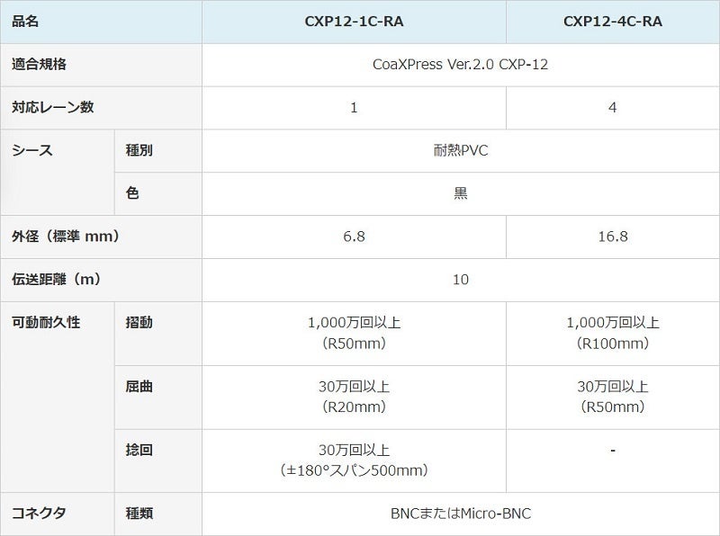 新商品「高耐久CoaXPress2.0ケーブル」は、CXP12-1C-RAとCXP12-4C-RAの2品種で構成されます。産業用ロボットの動作に対応できるようシールド構成を強化し、屈曲30万回(両品種)、捻回30万回(CXP12-1C-RA)の高い可動耐久性を実現しました。また、日本インダストリアルイメージング協会(JIIA)で規格化された画像伝送方式CoaXPress2.0規格に適合しており、シンプルな同軸構造のケーブル1本でカメラとの通信、制御、電源供給をサポートしつつ、これまでのカメラリンクやUSB3 Visionを上回る高速伝送を実現します。最大伝送速度は、1レーン(注2)対応のCXP12-1C-RAで12.5Gbps、4レーン対応のCXP12-4C-RAで50Gbpsです。