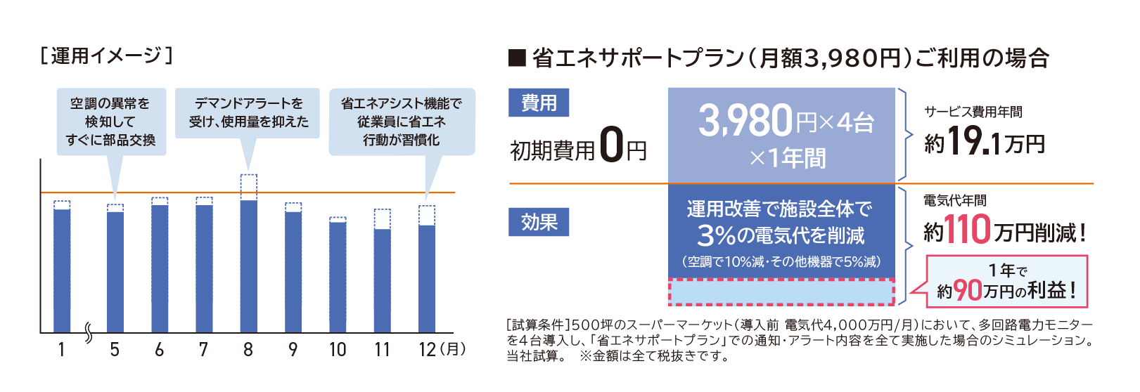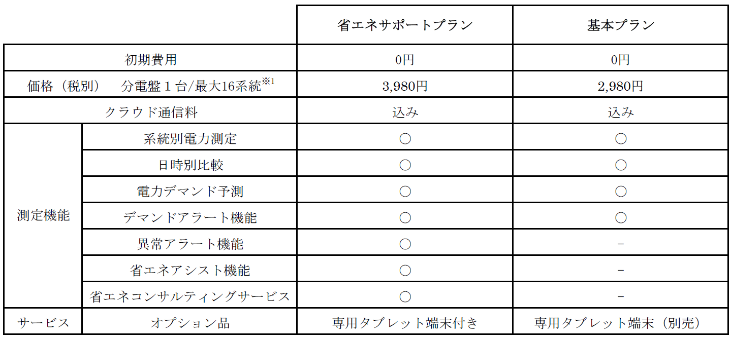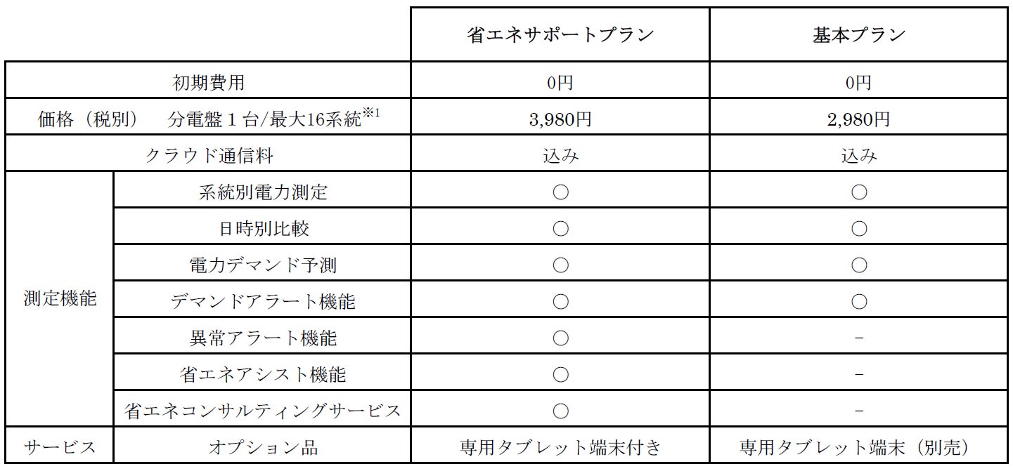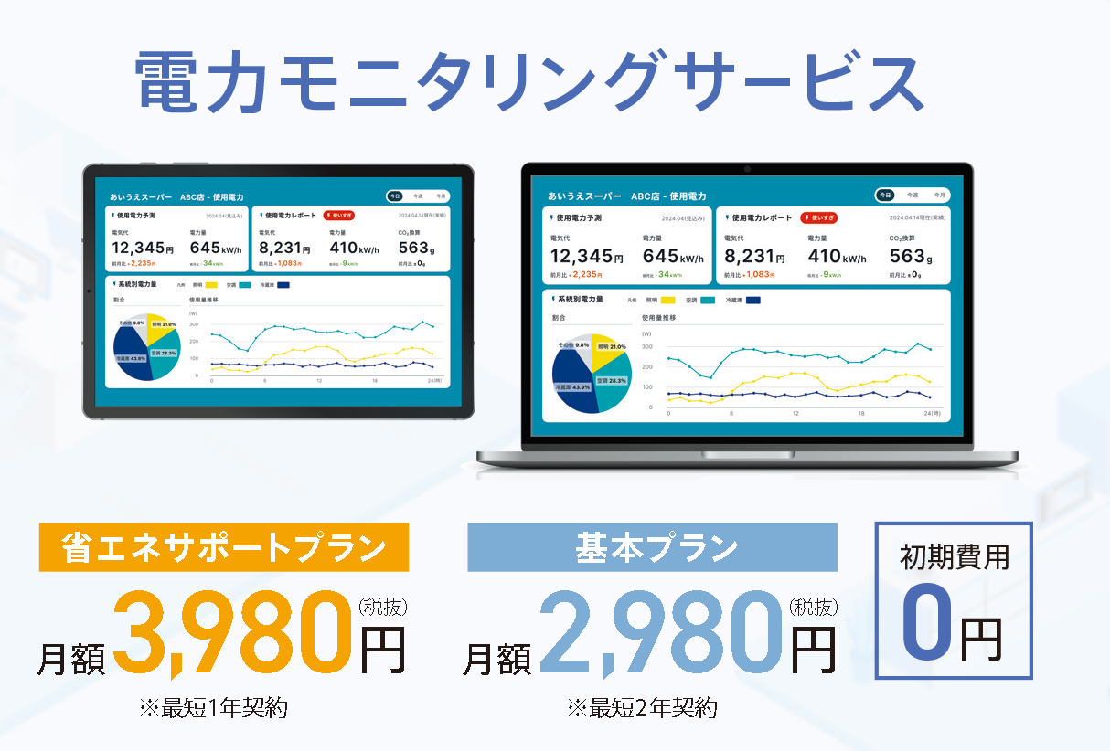 使用電力量を可視化する「基本プラン/2,980円(税別)」と、上記の省エネアシスト機能を追加した「省エネサポートプラン/3,980円(税別)」を活用すれば、初期費用が不要で省エネ対策を推進できます。多回路電力モニターは一括購入も可能です。