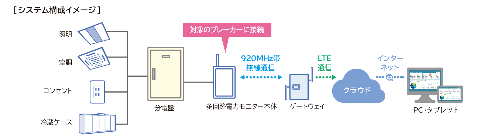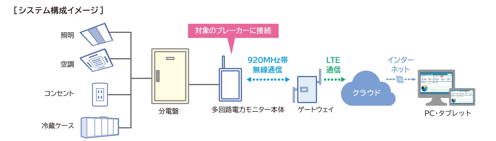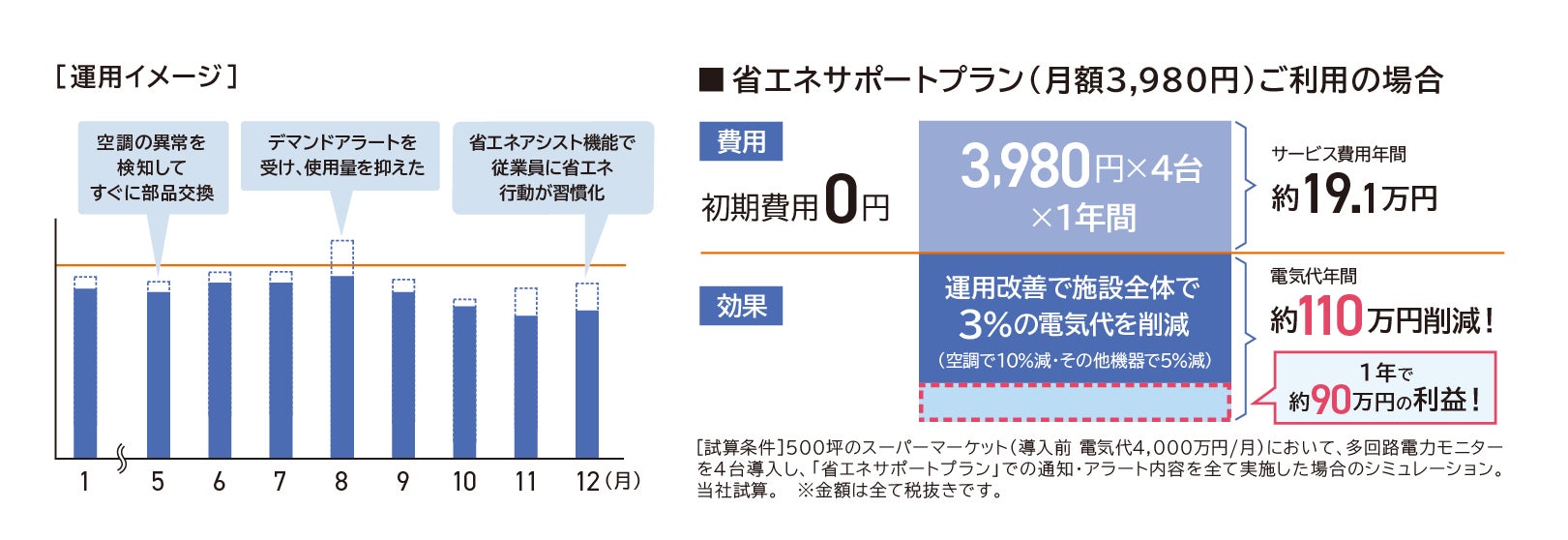 今回発売する多回路電力モニターは、本体1台と施設の分電盤を接続するだけで、施設の照明や空調、コンセント、冷蔵ケース、動力設備など、最大16系統(※1)の使用電力量を系統別にパソコンやタブレットから確認することができます。これにより、電気系統や設備ごとの電力を使用量が明確になるため、使用状況に合わせて省エネ対策ができます。また、月額サービスの省エネサポートプランの場合、多回路電力モニター運用中に使用電力量が急激に上昇した際に知らせる異常アラート機能や、最大需要電力を予測・監視して管理者にメールや発報で知らせるデマンドアラート機能といった省エネアシスト機能により、効率的な省エネを実現します。