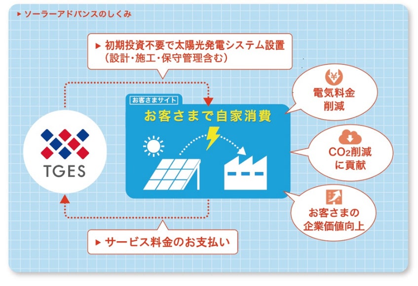 TGESが提供するサービスで、お客さまの施設の屋根や敷地に初期投資不要で太陽光発電を設置し、保守管理まで一貫したソリューションを提供します。自己託送のサービスでは独自のエネルギーサービス設備遠隔管理システム「ヘリオネットアドバンス(*5)」による発電量予測・運転監視を実施し、設備の最適な運用を計画・実行します。
