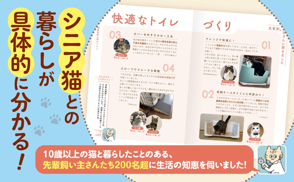 ごはん、飲み水、トイレの工夫から、闘病・介護・看取りの経験まで、先輩飼い主さんたちが伝えたい事柄が凝縮されています!