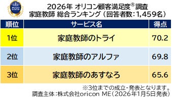 オリコン株式会社(本社:東京都港区 代表取締役社長:小池 恒、略称:オリコン)は、グループ会社である株式会社oricon MEが、実際のサービス利用者を対象に第三者の立場で実施した、『家庭教師』についての顧客満足度調査の結果を、2026年1月5日(月)14時に「オリコン顧客満足度®」公式サイト内にて発表いたしました。