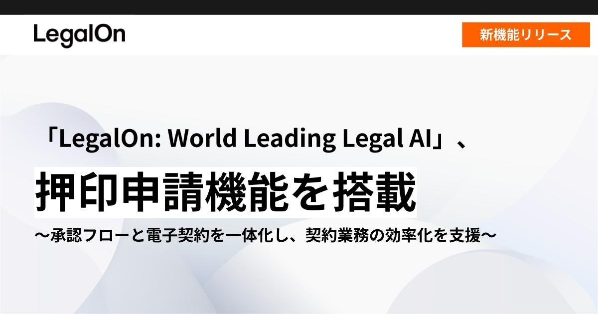 株式会社LegalOn Technologies(本社:東京都渋谷区 代表:代表取締役 執行役員・CEO 角田 望、以下LegalOn Technologies)が提供する、「LegalOn: World Leading Legal AI」( https://www.legalon-cloud.com/)の「サイン」において、新たに押印申請機能を搭載しました。これにより、契約締結における承認フローを「LegalOn」上で完結させることが可能となります。