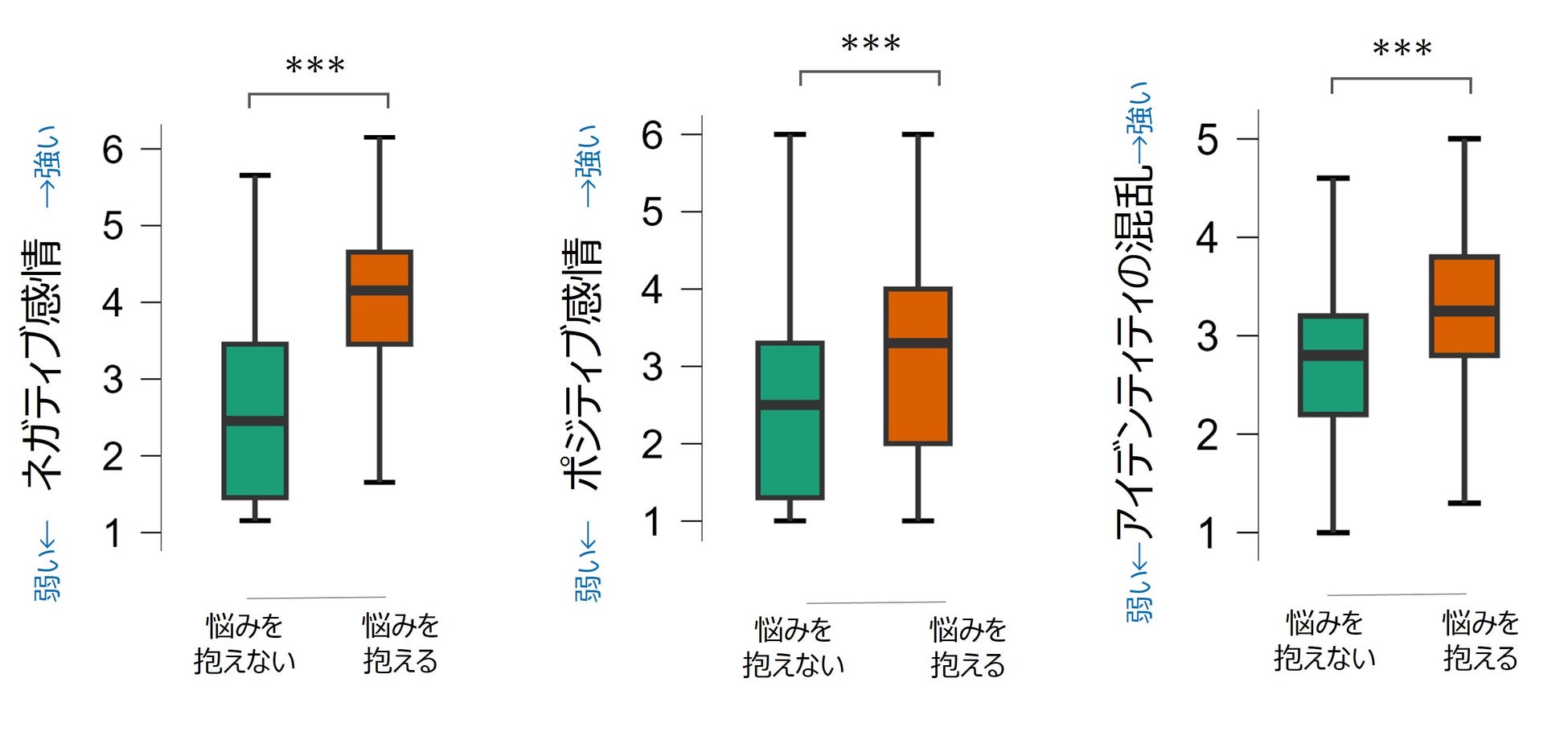 その結果、悩みを抱える層は抱えない層に比べて、不安などを示すネガティブ感情が明らかに強く、自己肯定などを示すポジティブ感情もやや強く表れました(図2)。これは、外見の悩みを抱える層はネガティブ感情を感じやすく、感情の揺れ動きが大きいことを示唆しています。また、アイデンティティの確立を乱す、混乱の度合いは悩みを抱える層の方が強く表れました。このことから、肌や外見の悩みは感情のゆらぎを引き起こし、アイデンティティの混乱に繋がる可能性が示唆されました。