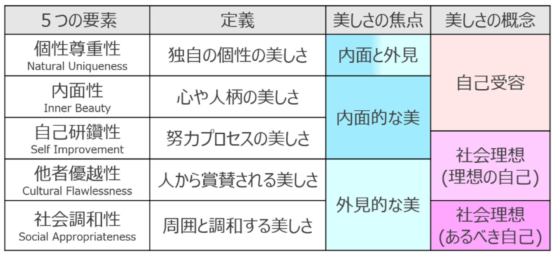 という3層の構造モデルを仮定し、5つの美容価値観(図3)がそれぞれどのような影響度があるかを解析しました。その結果、個性尊重性、社会調和性、他者優越性はポジティブ感情を介して、アイデンティティの統合(確立)や幸福感に繋がることが分かりました(図1右)。個性尊重性は“自分らしい”美しさであり、この3つの価値観の中で最も大きな影響度をもっていました。社会調和性は周囲と調和する美しさであり、個性尊重性に次ぐ影響度である反面、ネガティブ感情への影響も認められました。他者優越性は他者から賞賛される美しさであり、3番目にポジティブ感情に影響がある価値観でした。