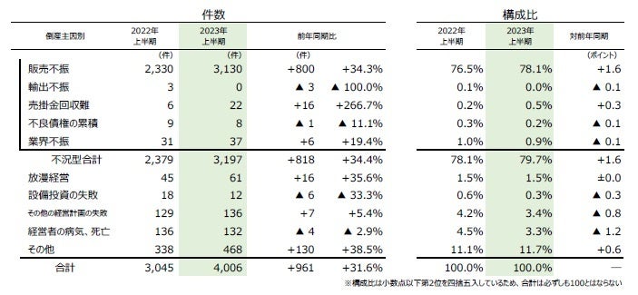 主因別にみると、「販売不振」が3130件(前年同期2330件、34.3%増)で最も多く、全体の78.1%(対前年同期1.6ポイント増)を占めた。「売掛金回収難」(前年同期6件→22件、266.7%増)や「業界不振」(同31件→37件、19.4%増)などを含めた『不況型倒産』の合計は3197件(同2379件、34.4%増)となり、上半期としては2年連続で前年を上回った。