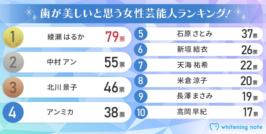 審美歯科に関するおすすめ情報を発信するメディア 「Whitening Note (ホワイトニングノート)」(運営会社:株式会社NEXER)は、「歯が美しいと思う女性芸能人」に関する調査を実施し、その結果をサイト内にて公開しました。