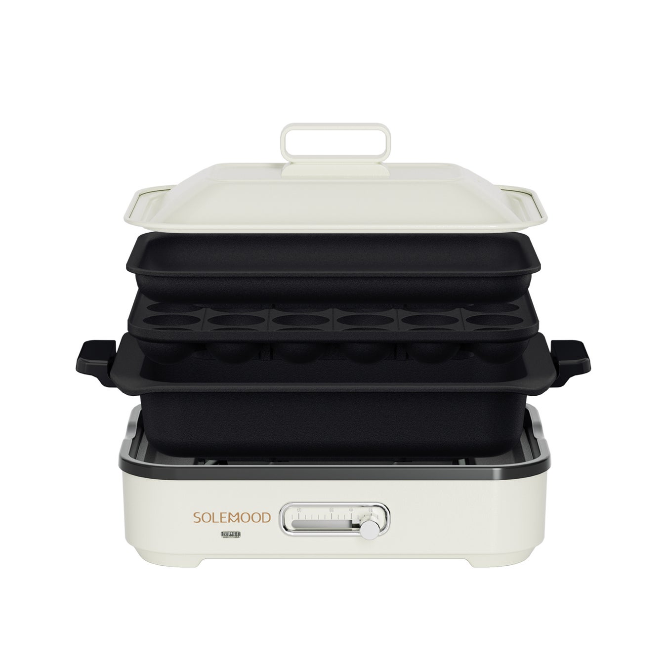 平面・深鍋・たこ焼きの3プレートを付け替えるだけで、焼肉・鍋・たこ焼き・スイーツなど幅広いメニューに対応。コンパクトでも1~4人分にちょうど良く、パーティーでも活躍します。