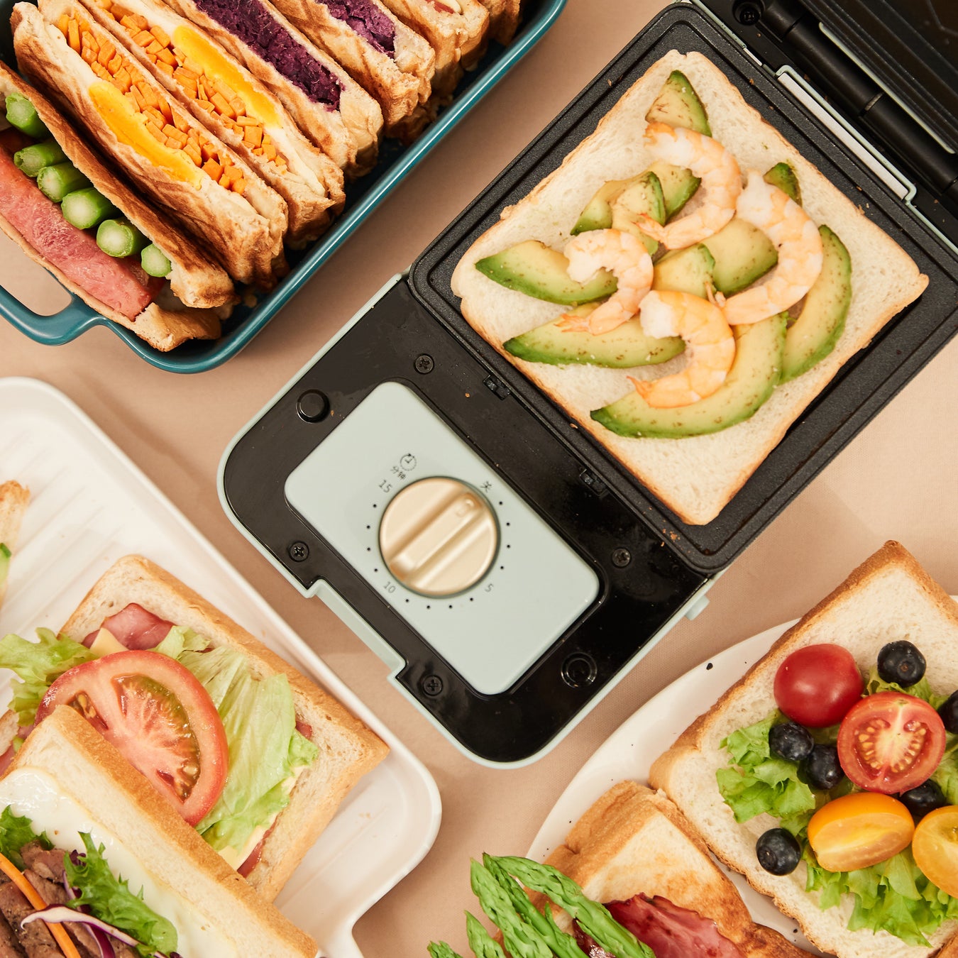 サンド用2枚+ワッフル用2枚の着脱式プレート。ホットサンド、ワッフルなどこれ1台で調理可能。レシピ付きで毎日の朝食やおやつに大活躍。