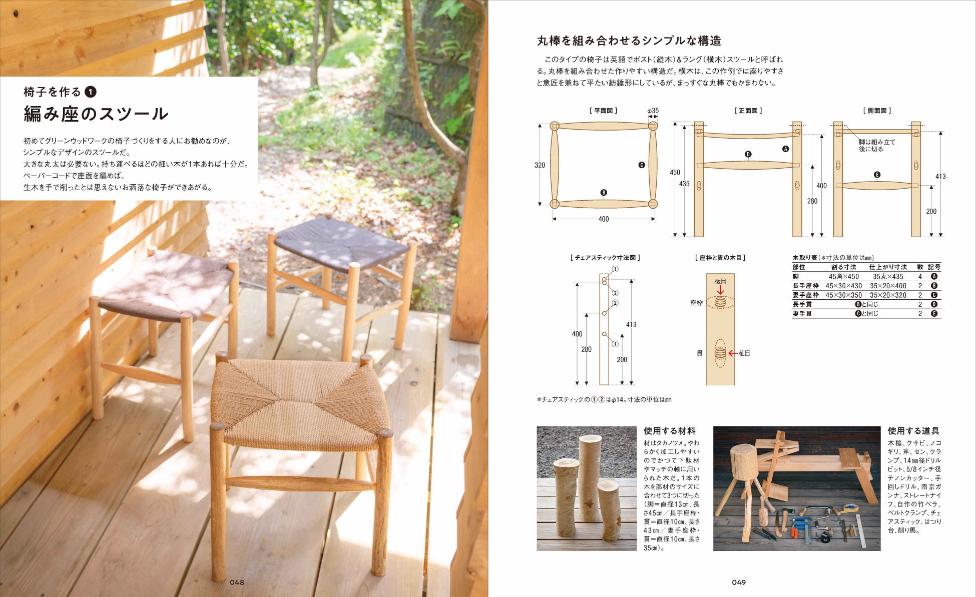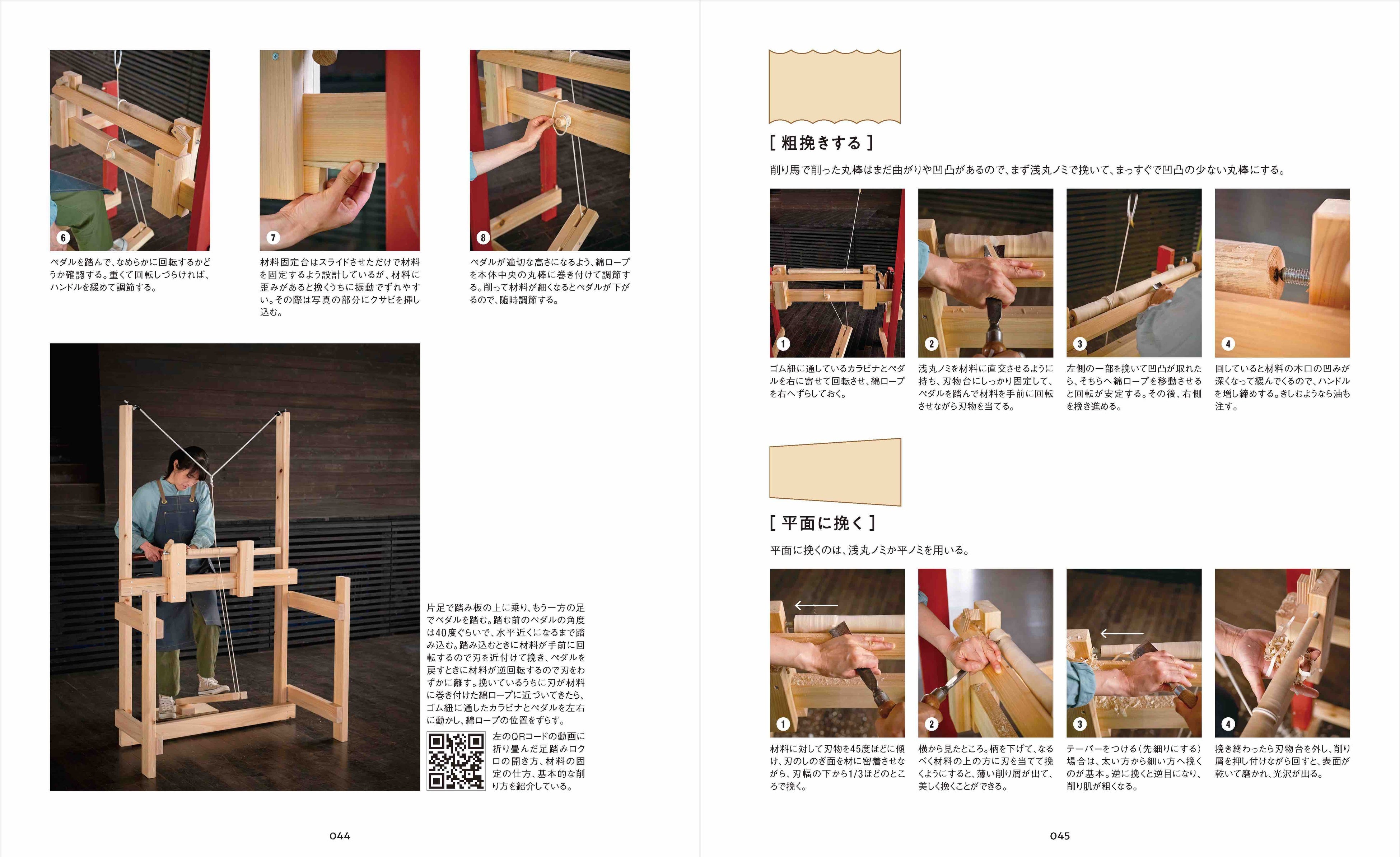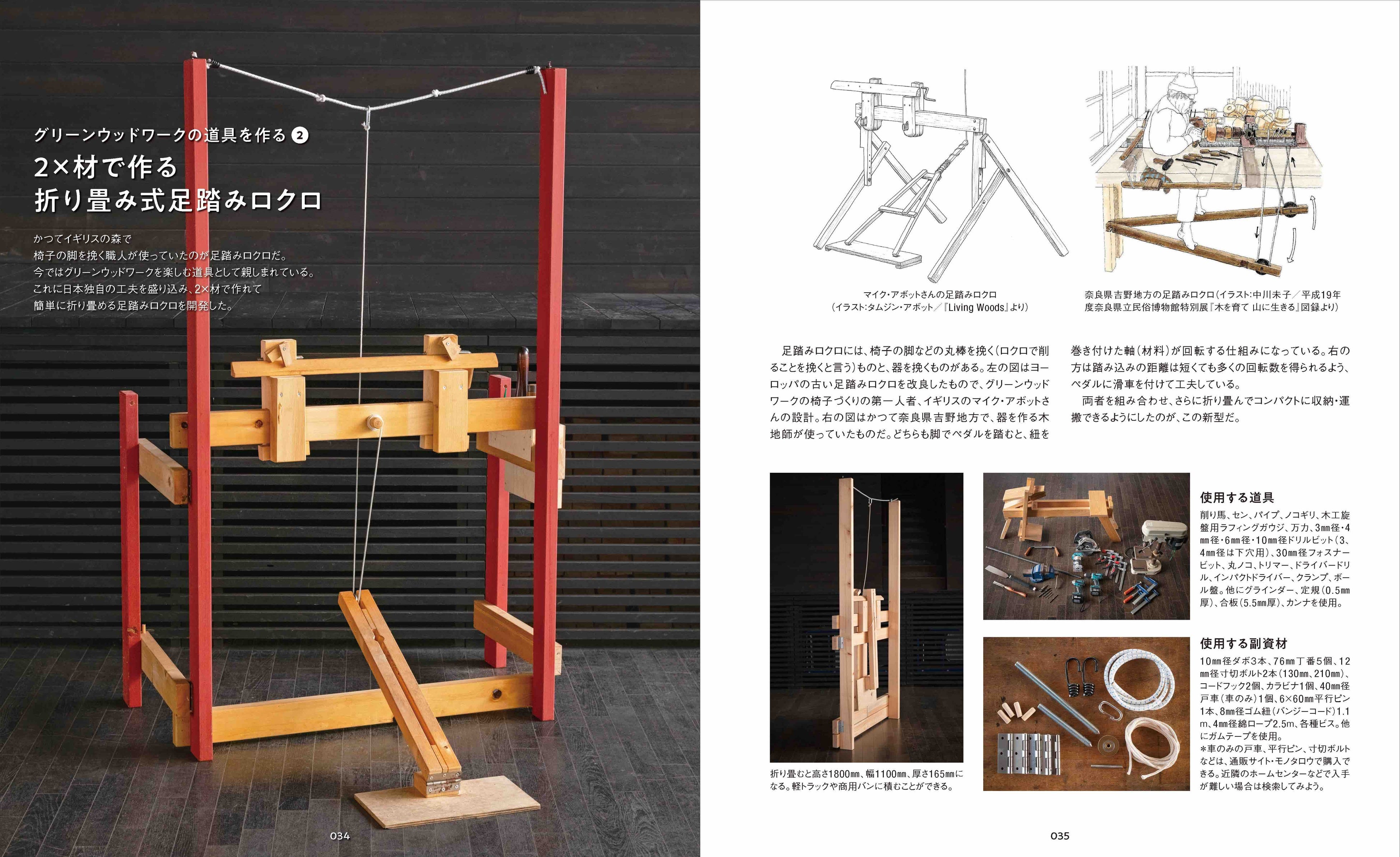 「作業の流れ」や「使用する道具」といった基礎知識に始まり、グリーンウッドワークならではのユニークで楽しい道具「削り馬」と「足踏みロクロ」の自作方法から、スツール各種、ウィンザーチェア、ラダーバックチェアなど7種の椅子の作り方まで、作業手順を細かくていねいに紹介。