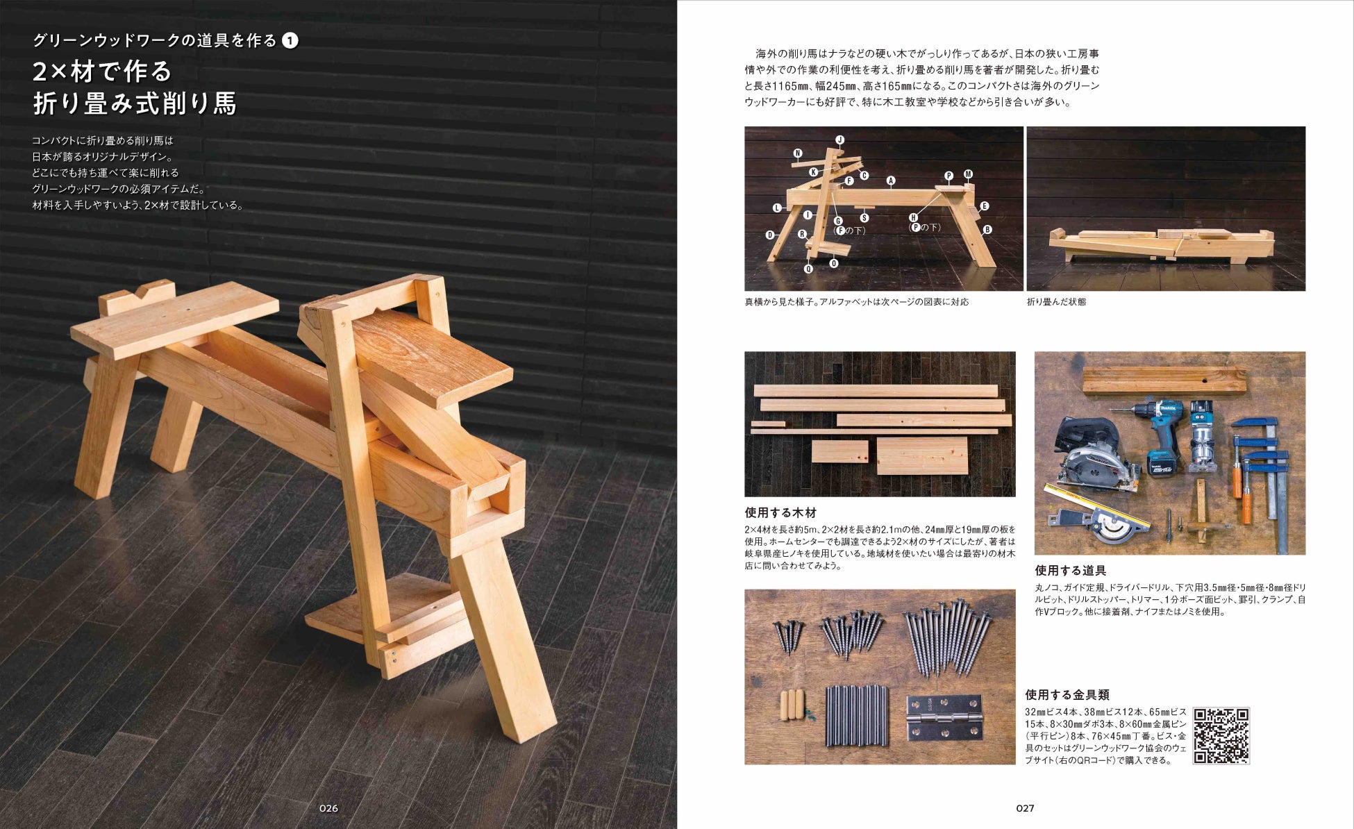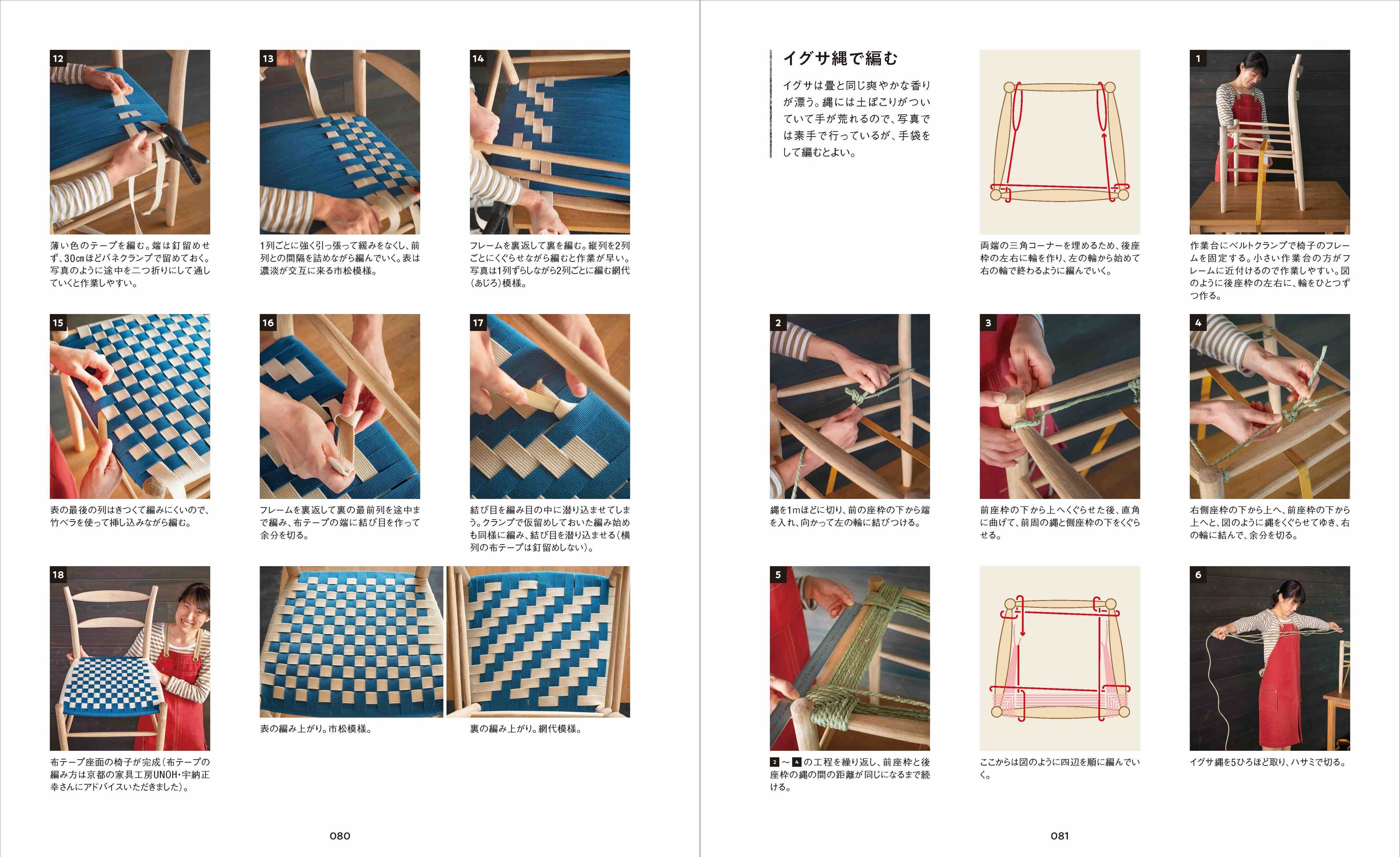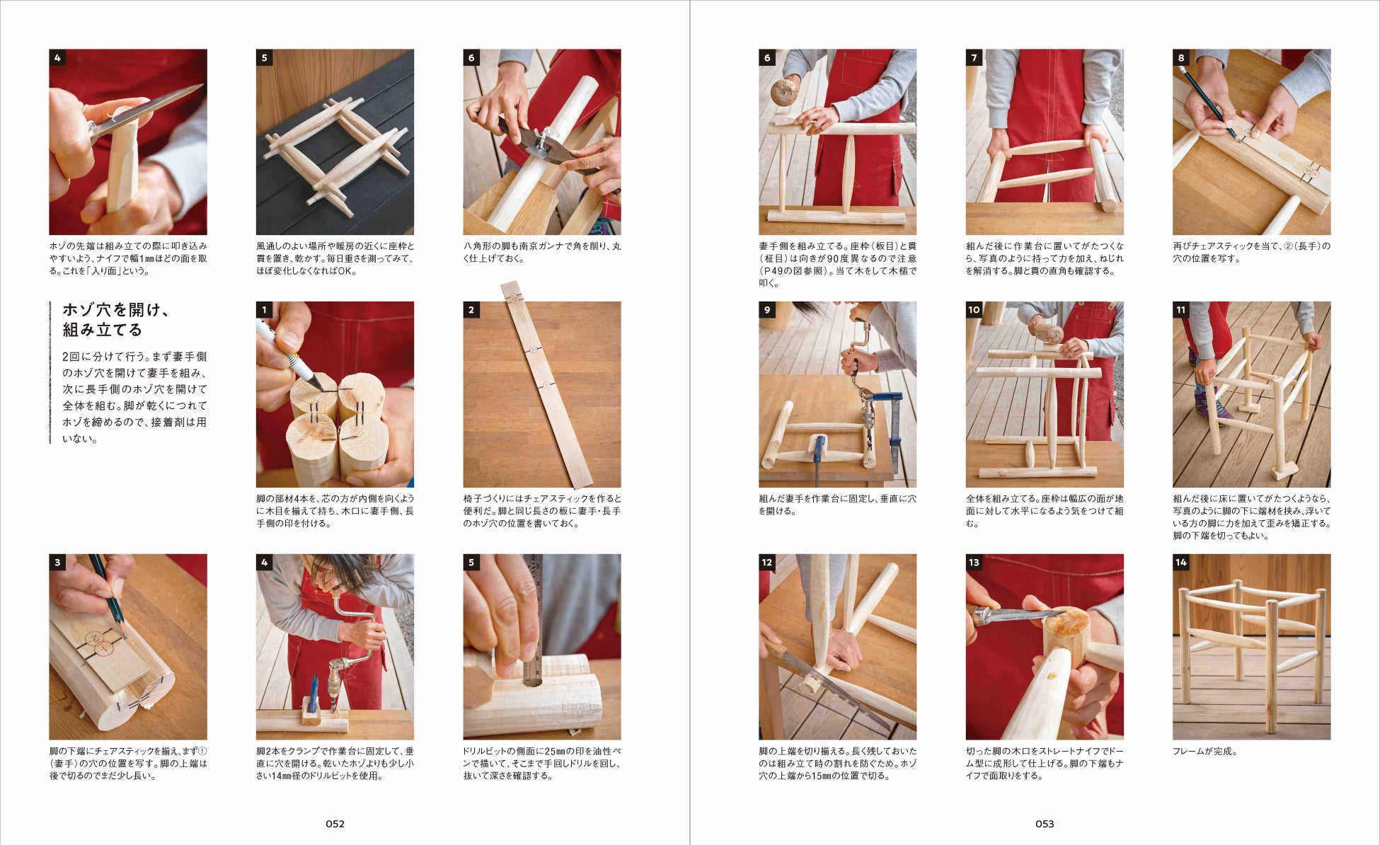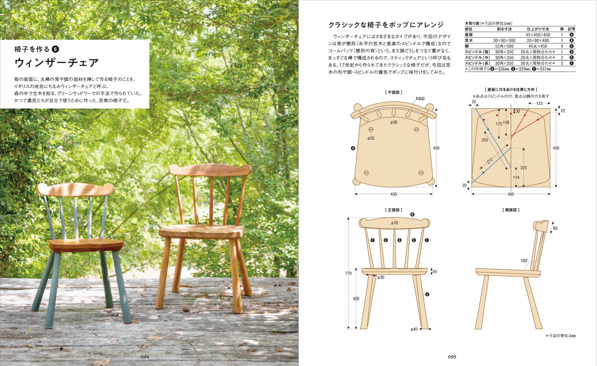 「作業の流れ」や「使用する道具」といった基礎知識に始まり、グリーンウッドワークならではのユニークで楽しい道具「削り馬」と「足踏みロクロ」の自作方法から、スツール各種、ウィンザーチェア、ラダーバックチェアなど7種の椅子の作り方まで、作業手順を細かくていねいに紹介。