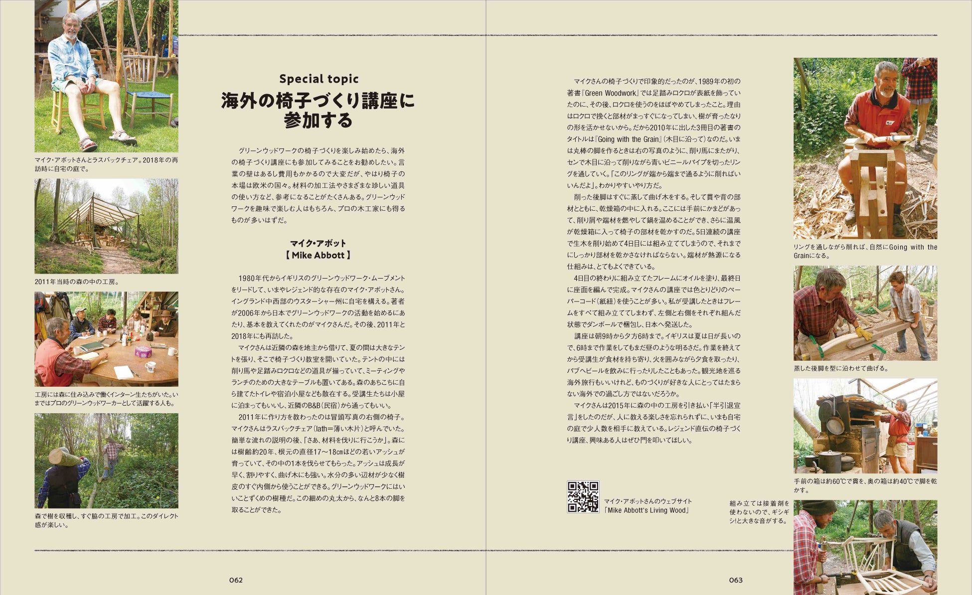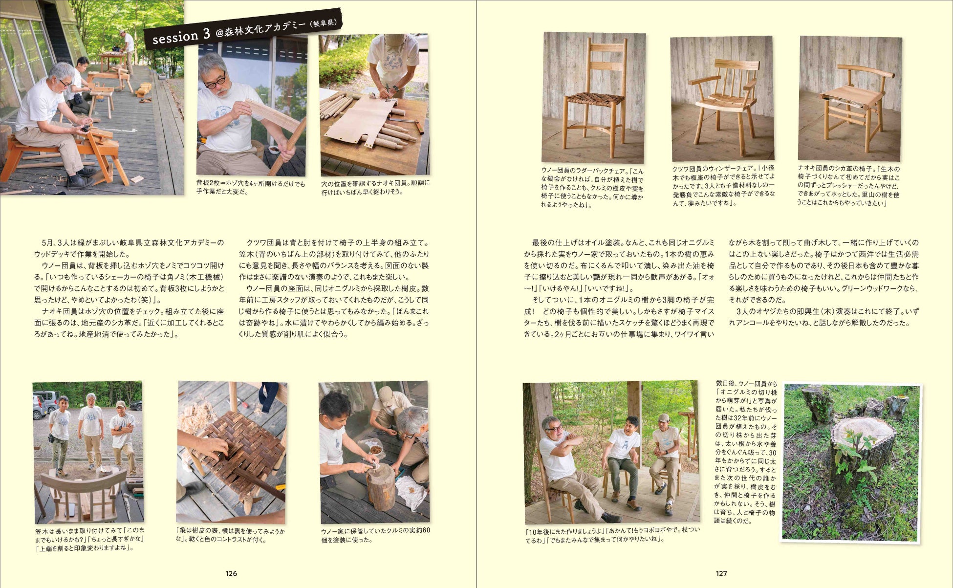 さらに、長年にわたり海外のグリーンウッドワーカーと交流しながら国内でのグリーンウッドワークの普及に尽力してきた著者だから披露できるエッセイ「海外の椅子づくり講座に参加する」「ゴッホの椅子の故郷を訪ねる」「地域材利用のムーブメントと『樹の一脚展』」や、著者を含む3人の椅子マイスターが樹を伐るところから始め、図面なしで生木ならではの椅子づくりを楽しんだ「椅子マイスターたちの即興生(木)演奏」を読めば、グリーンウッドワークの椅子づくりの楽しさがいっそう広がり、深まります。