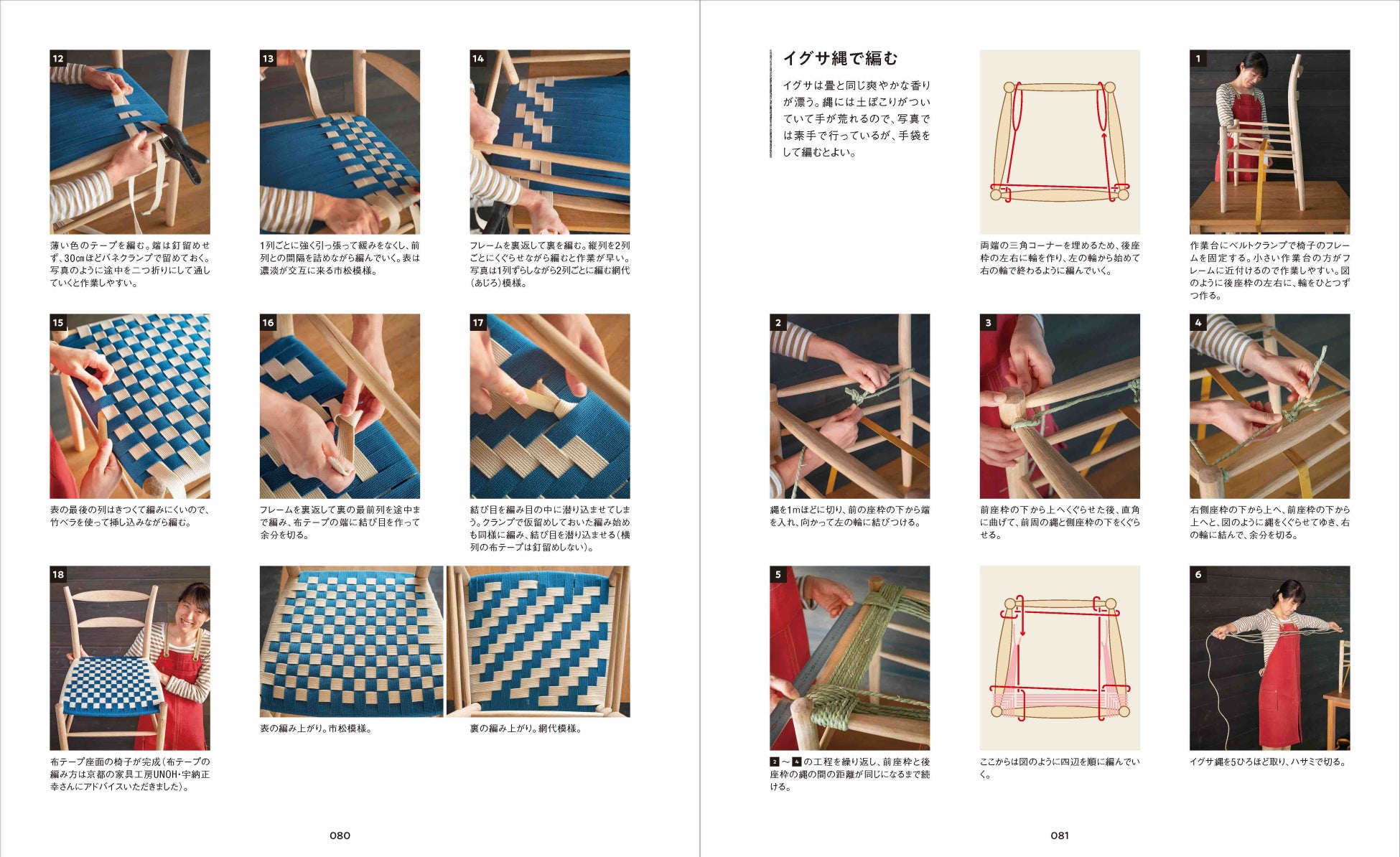 座面の種類もペーパーコード編み、布テープ編み、イグサ編み、樹皮編み、板座とバラエティー豊富で、好みのタイプの椅子づくりに役立てることができます。