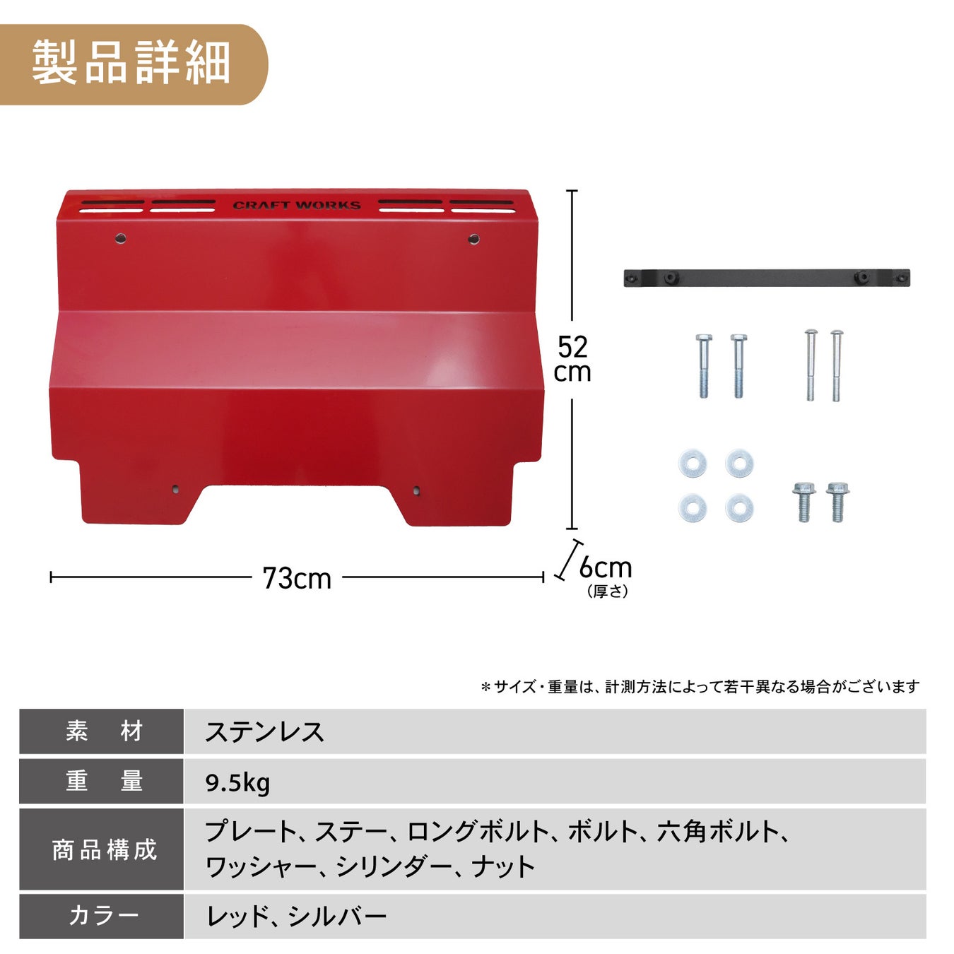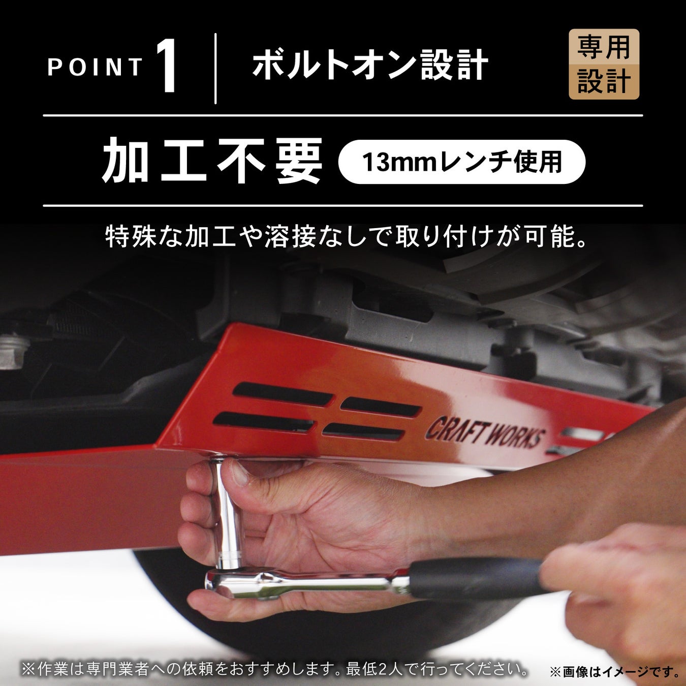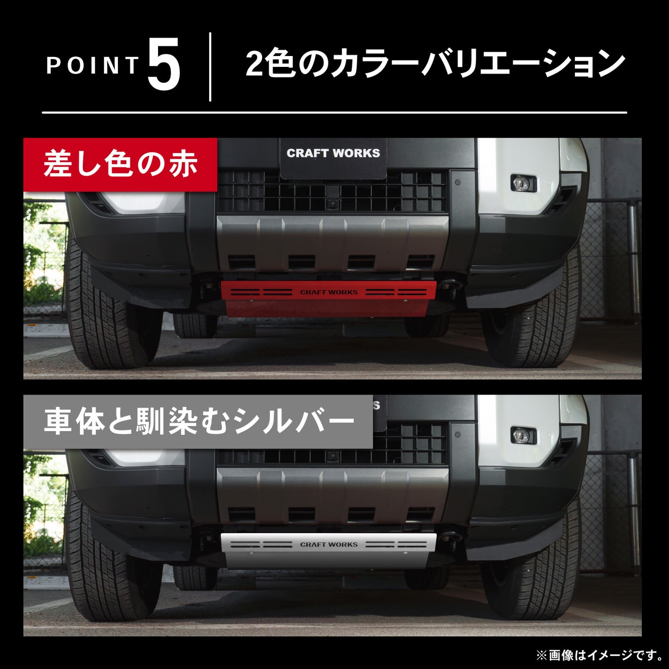 アルミ製で、岩や石から車両を守り、オフロード走行時の衝撃からボディ下面を保護。