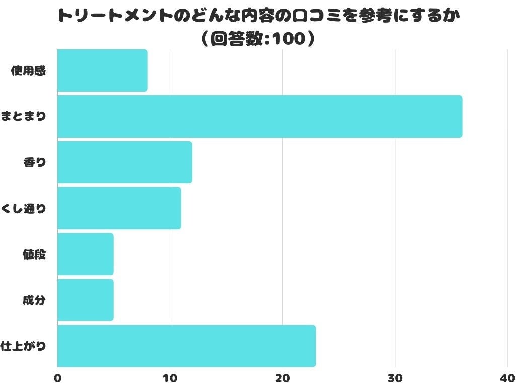トリートメントのどんな内容の口コミを参考にするかをアンケートにて調査したところ、1位は「まとまり」でした。