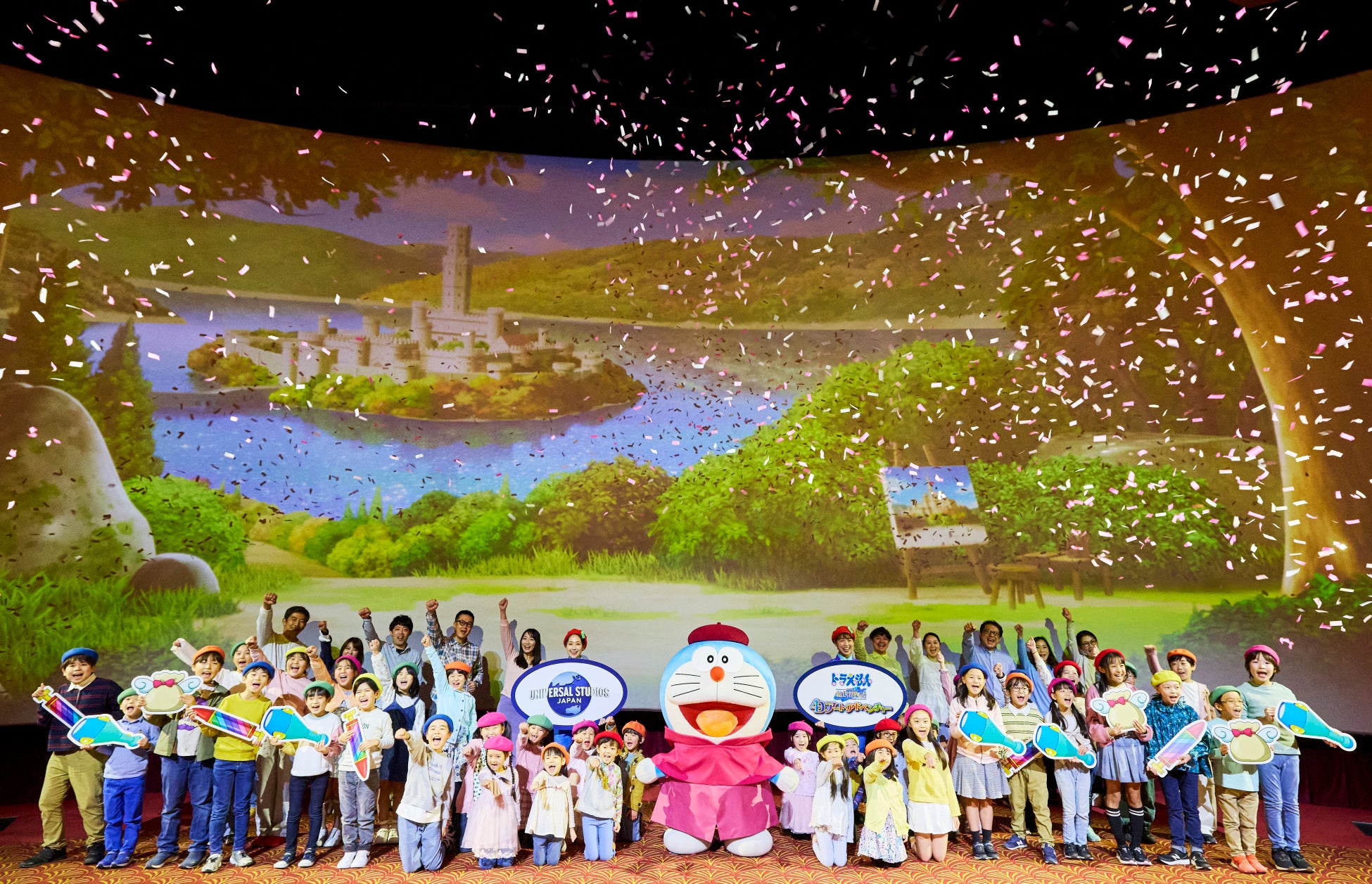 最後に、「ドラえもん」の「家族みんなで一緒にいこう!行先は絵の中!心躍る大冒険!」という掛け声に、子どもたちも声も合わせると、会場には春をイメージしたスモークと紙吹雪が舞い、明日からのワクワクドキドキの大冒険のスタートを祝いました。そして、明日のオープンを楽しみにしているゲストに向けて、「ドラえもん」は、「みんな、僕と絵の中の大冒険、ぜひたくさんの人と一緒に楽しんでね!」と語りました。
