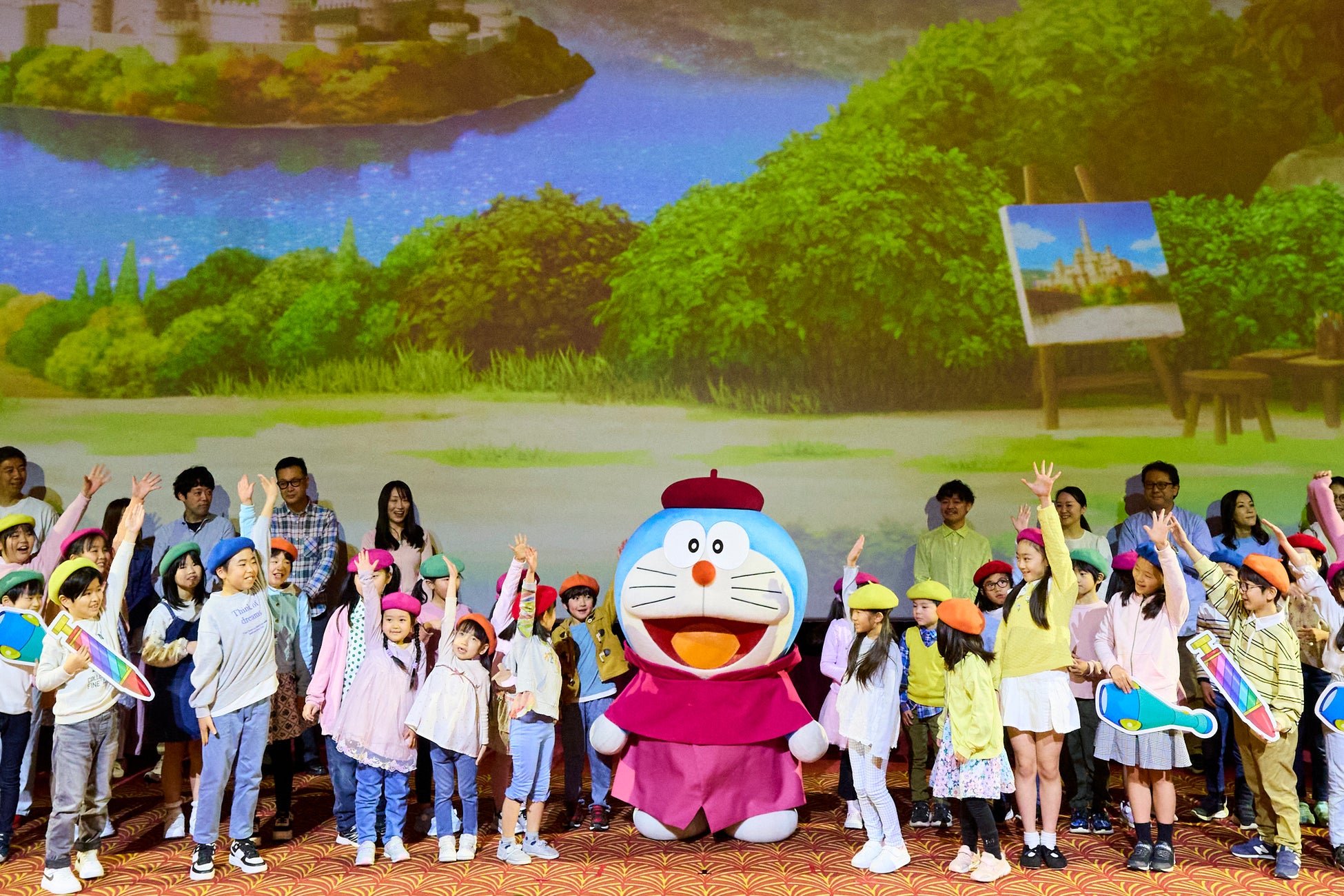 続いて、MCと子どもたちが声を合わせて「ドラえも~ん!」と呼びかけると、映画と同じマントとベレー帽を被ったアートな装いの「ドラえもん」が元気よく登場。「みなさん、こんにちは!ぼく、ドラえもんです。」と話しかけると、会場は「会いたかったよー!」「かわいー!」と「ドラえもん」を笑顔で出迎えました。