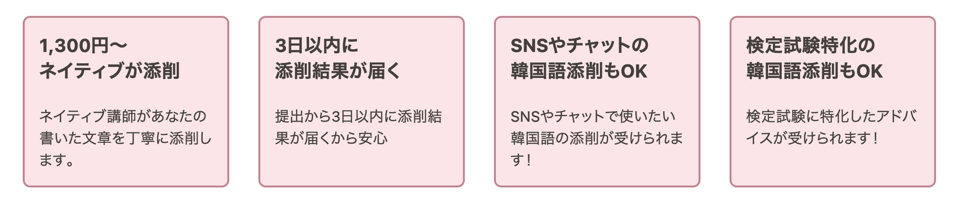 1,000文字までの文章をネイティブの韓国語講師が丁寧に文章を添削し、3日以内に返送します。