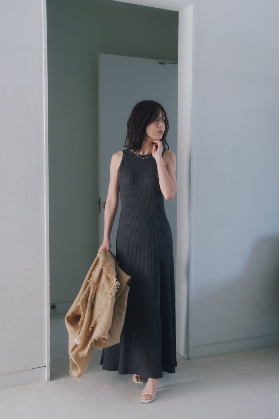 「ánuans」で毎シーズン好評を得ているリブ素材のマーメイドワンピースに、「OUR WACOAL」のカップ構造を組み合わせたカップインウェア。広めにあけたバックネックが特長で、ヘルシーな肌見せコーディネイトを楽しめます。