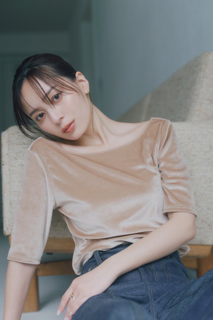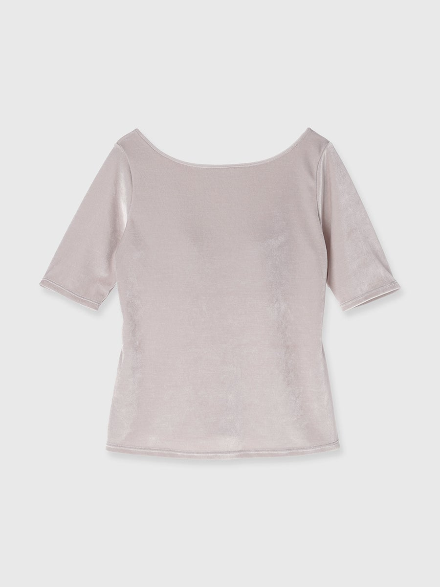トレンドのベロアを使った、バックオープンのトップス。トリアセテート混のベロア生地を使い、やわらかくなめらかな肌ざわりと、上品な光沢感を楽しめます。