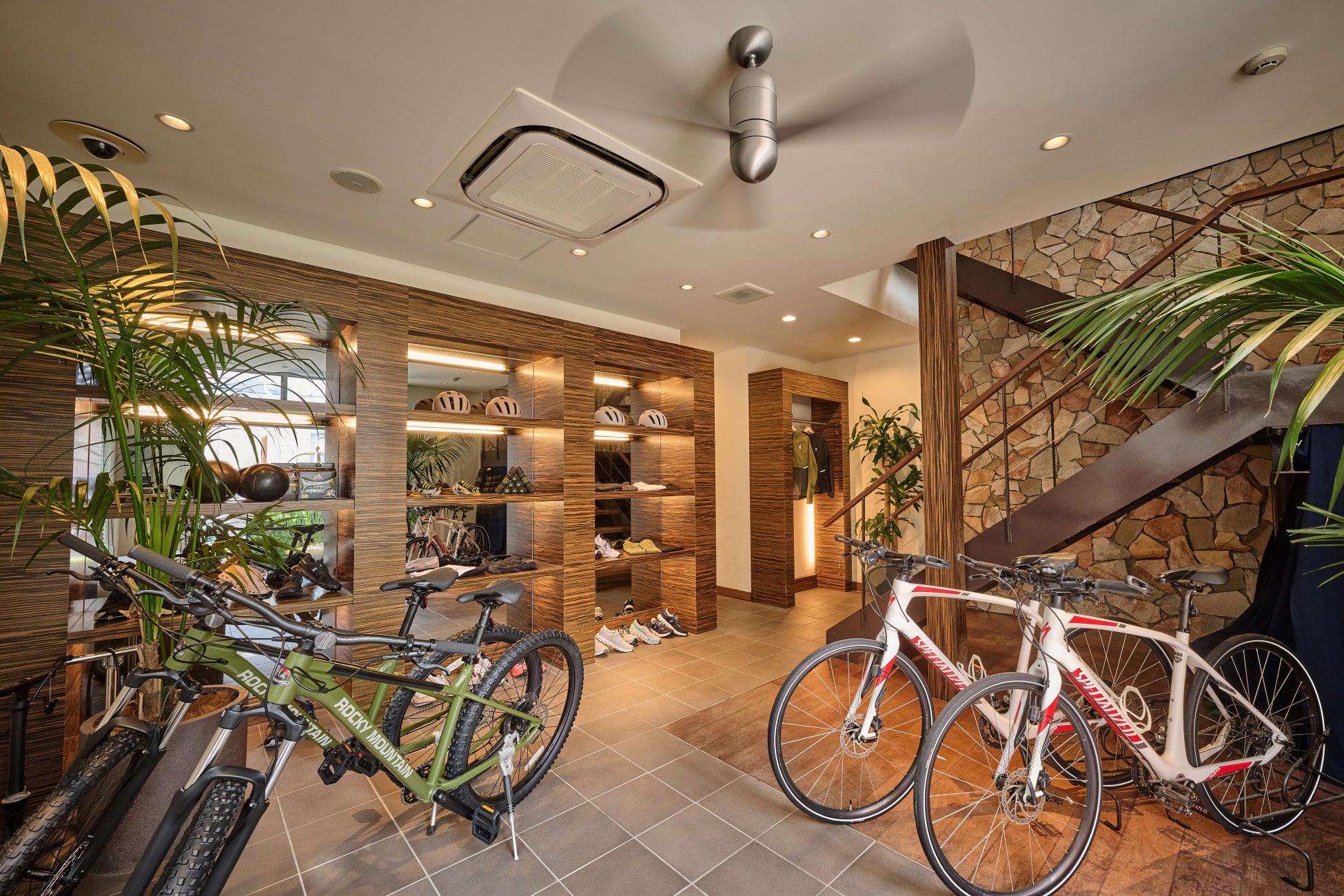 「動」アクティブレストには、ヨガマット、マウンテンバイク、ランニングシューズやバランスボールなどのアクティビティをご用意しています。それぞれウェアやシューズはサイズ別にて取り揃え、お貸し出ししています。