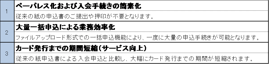 「JCB法人使用者WEB入会サービス」をご活用いただくことで、お客様の紙ベースでの業務負荷削減、また、効率的な業務運営が見込めます。
