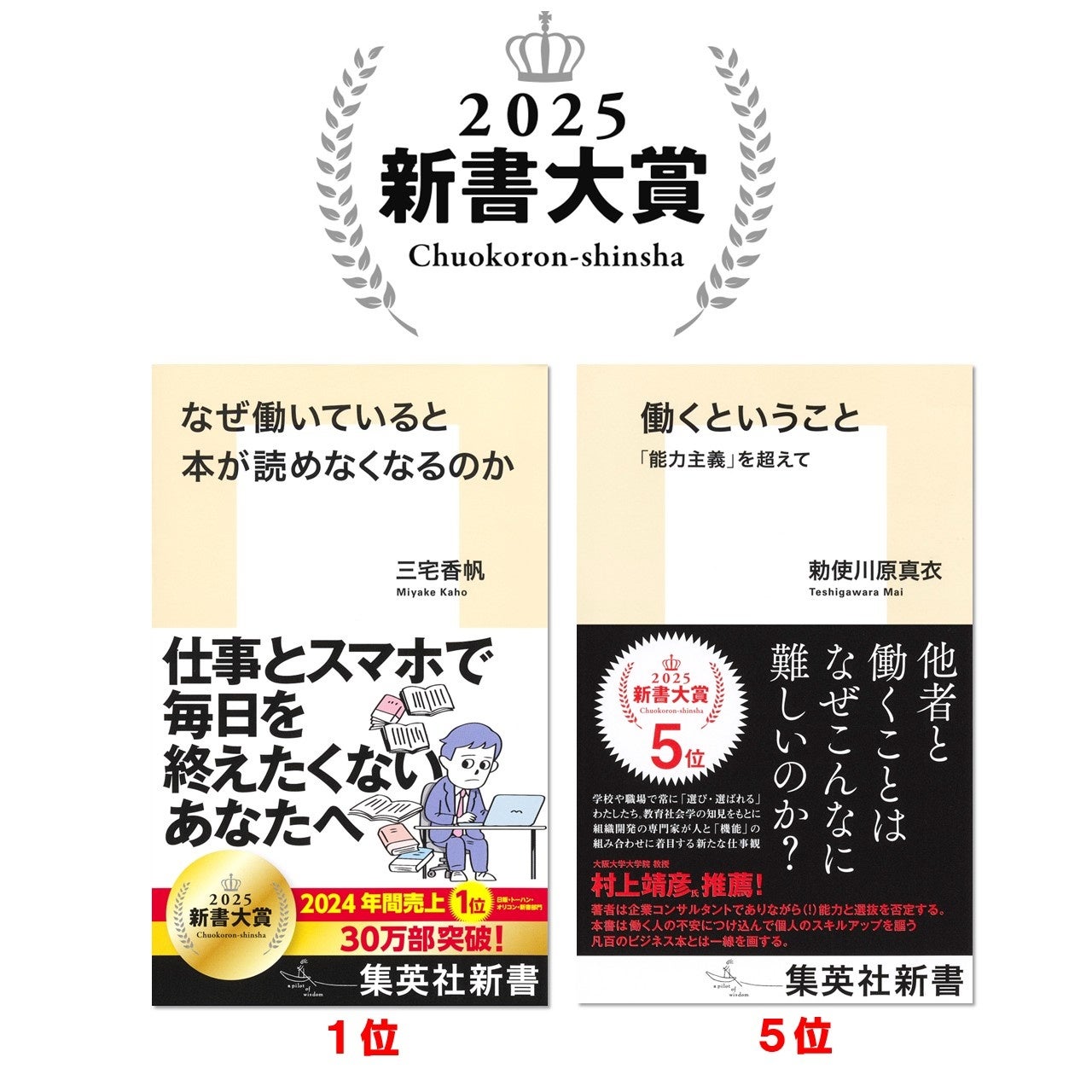 「新書大賞」(中央公論新社主催)は、1年間に刊行されたすべての新書から、その年「最高の1冊」を選ぶ賞です。今回の「新書大賞2025」は、2023年12月~2024年11月に刊行された新書を対象に、有識者、書店員、各社新書編集部、新聞記者など新書に造詣の深い方々の投票によって集計。その結果、集英社新書の2冊『なぜ働いていると本が読めなくなるのか』(三宅香帆・著)が大賞に、『働くということ 「能力主義」を超えて』(勅使川原真衣・著)が5位に輝きました。