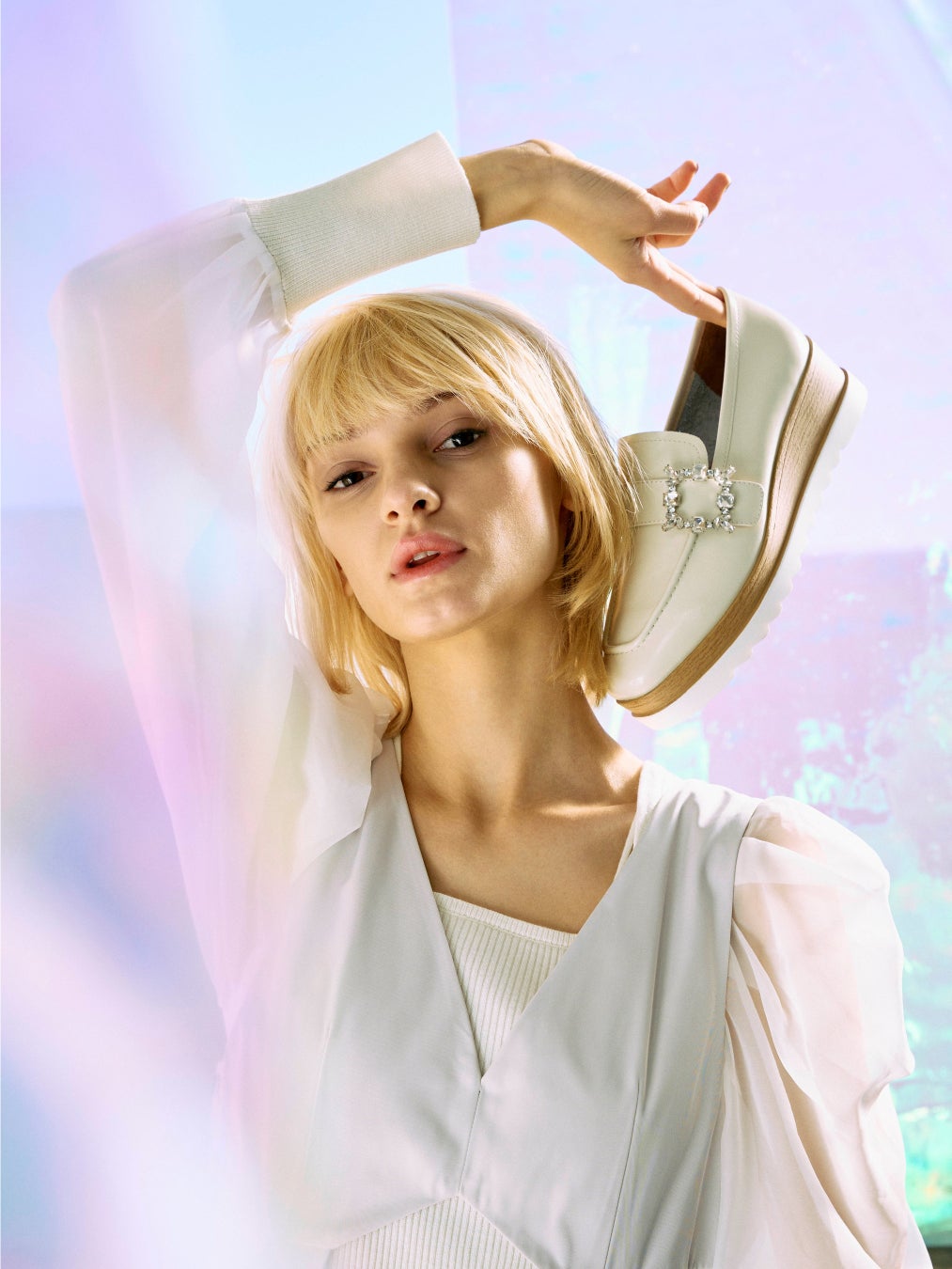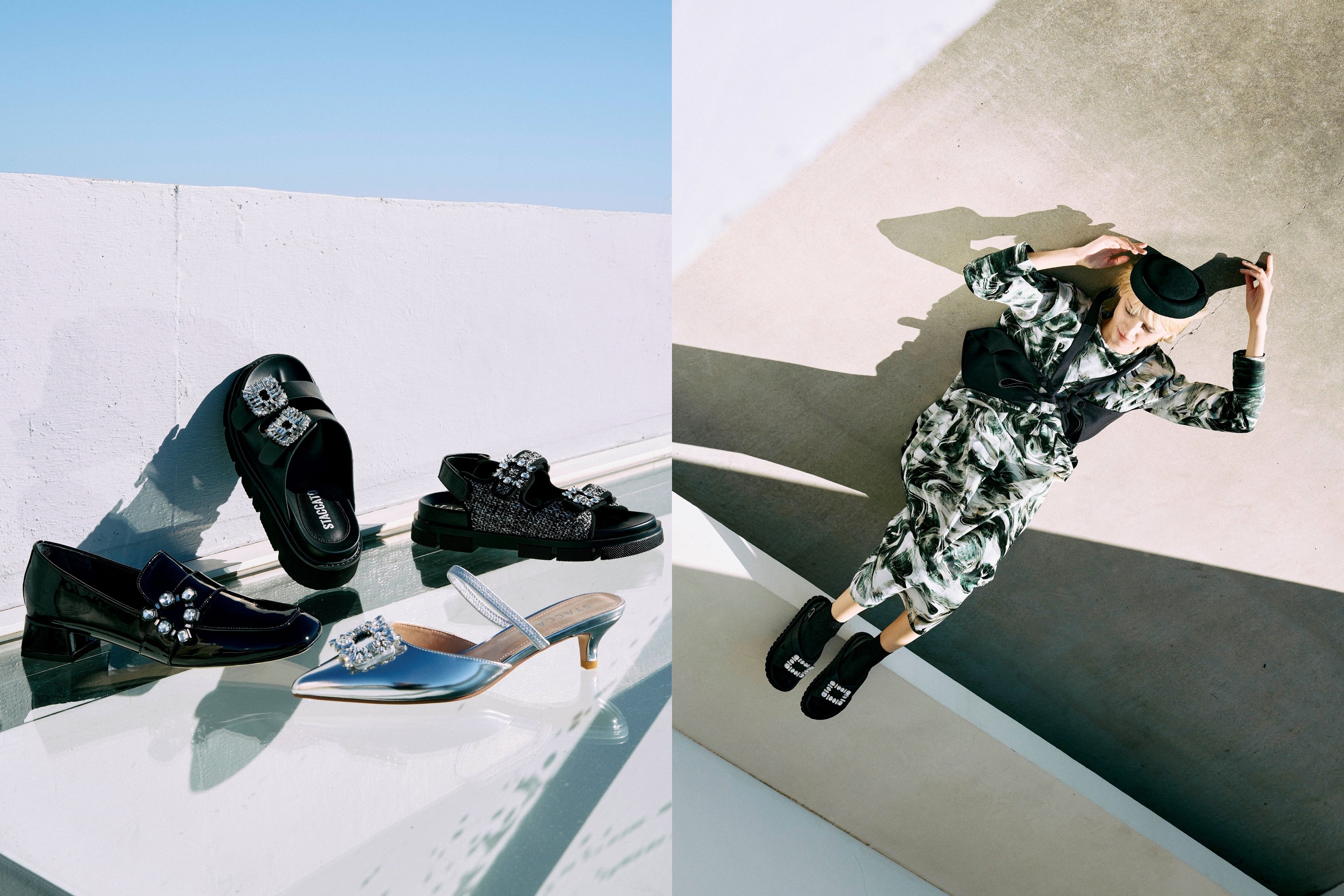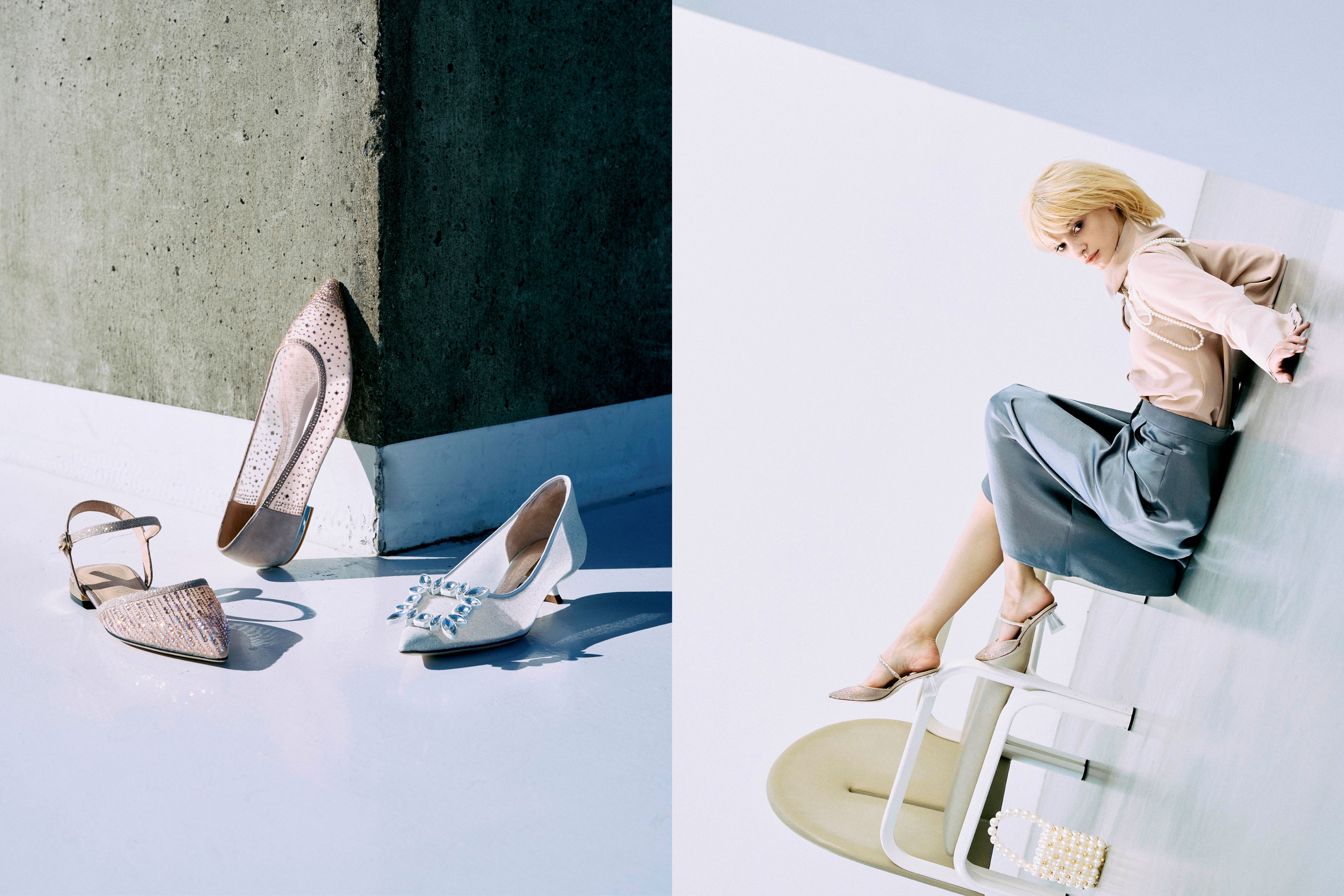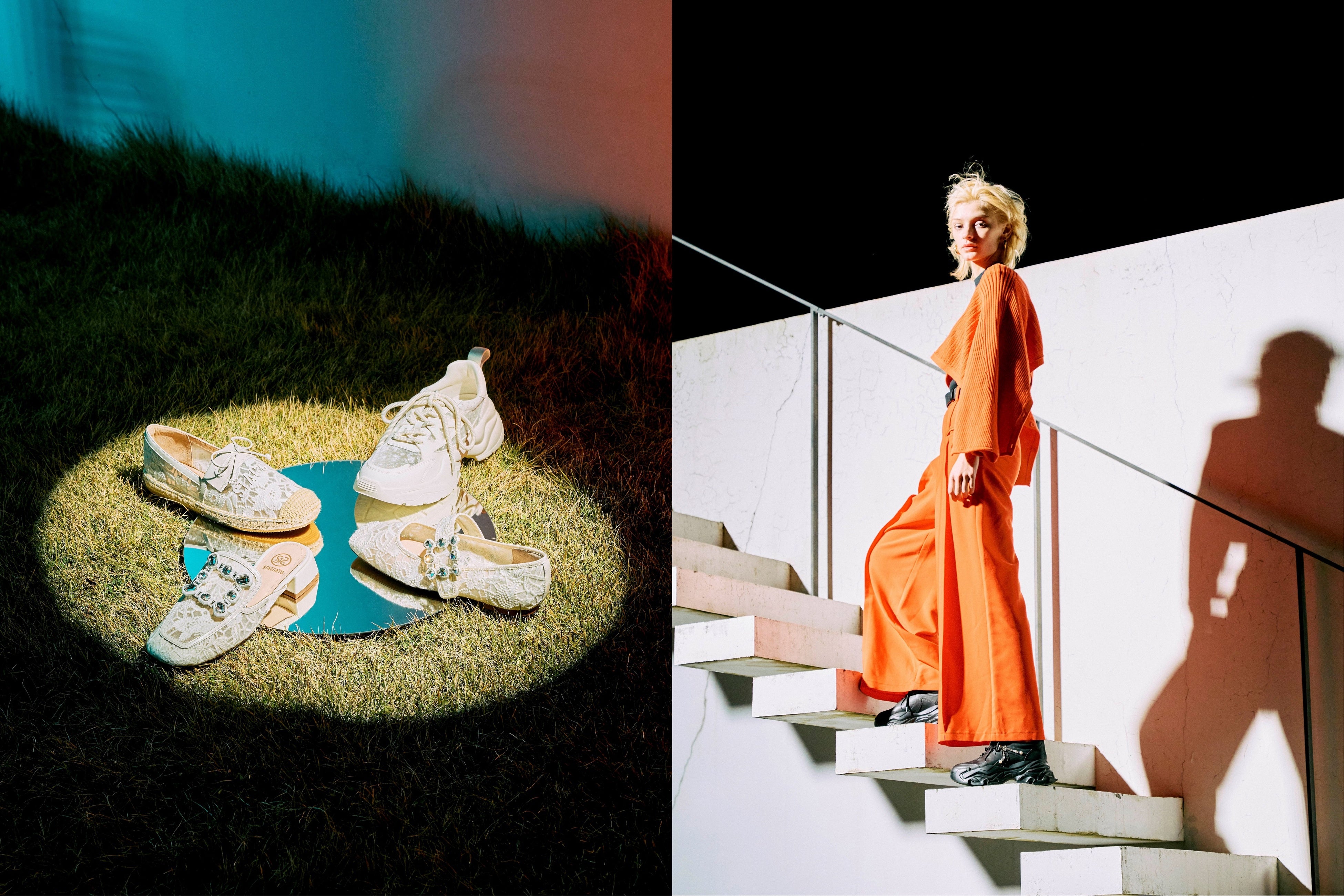 自然界やメタバース・宇宙空間からインスピレーションを受け、柔らかなカラーをメインにシルクやチュール、クリスタルなどを取り入れたものや、STACCATO定番デザインのバックルやパールをあしらったデザインのものなど、デザインバリエーション豊富にアイテムを展開。