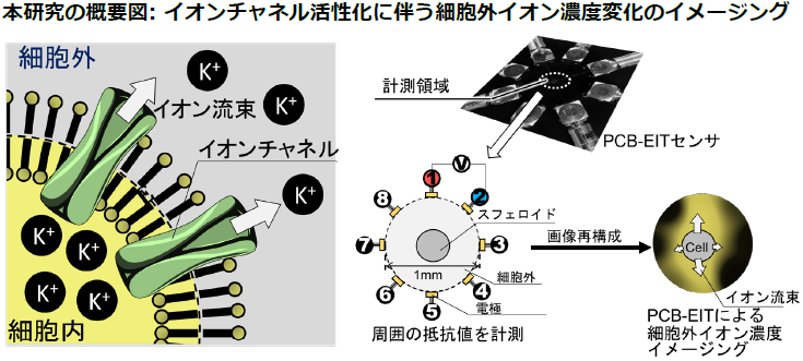本研究チームは、プリント基板に配置した微小電極アレイセンサを用いた電気インピーダンス・トモグラフィ法(PCB-EIT)を新規に開発しました(概要図 イオンチャネルを介した細胞内外のイオン輸送(左)、PCB-EITによる細胞外イオン濃度イメージング概略(右))。電気インピーダンス・トモグラフィ法(EIT)と呼ばれる手法では、非侵襲なイメージングを可能としますが、電極を細胞周囲に配置する必要があるため、細胞や組織サイズでの測定には不向きでした。そこで、PCB-EITでは微小空間に多数の電極を配置することで、EITの細胞・組織への適用を可能としました。
