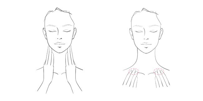 最後に指で耳の下から鎖骨に向かってすべらせ、鎖骨の上を軽くプレスします。