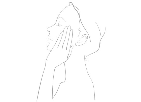 顔を少し上に向けて目を閉じ、ハンドプレスで内側から外側へ数回に分けて、やさしく顔全体になじませます。